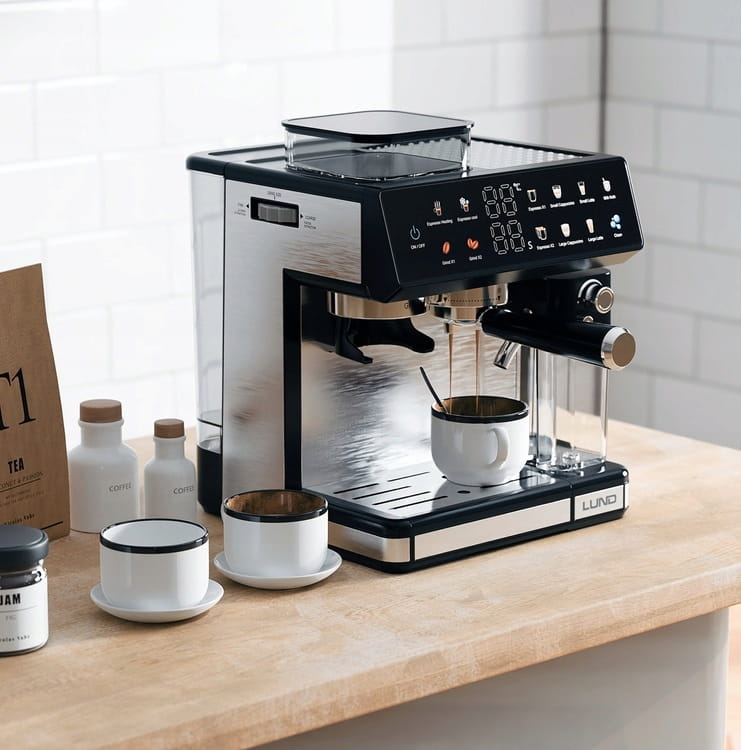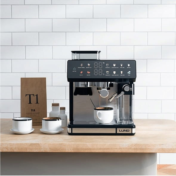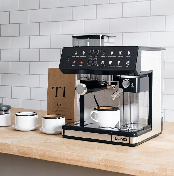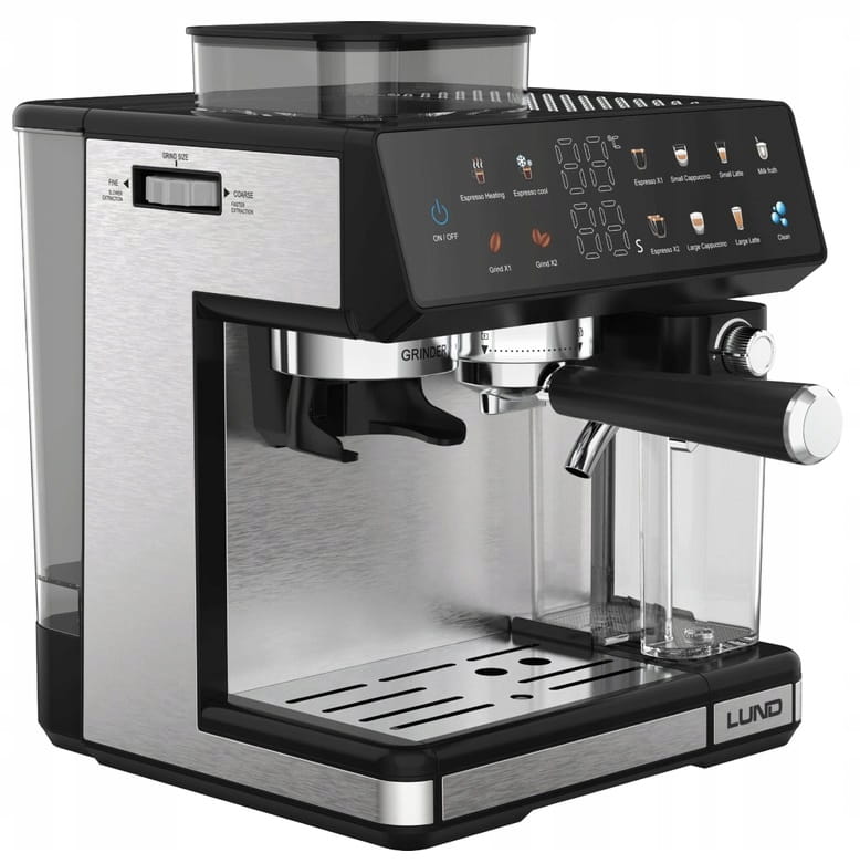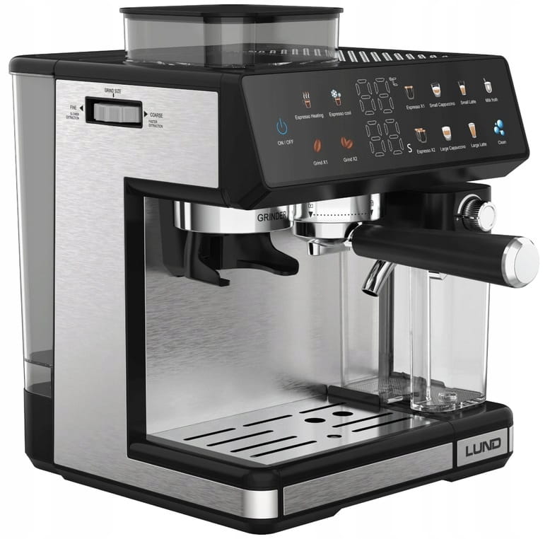 Ekspres ciśnieniowy z młynkiem żarnowym i spieniaczem LUND 68501 to połączenie nowoczesnego, stalowego designu z funkcjonalnością. Oferuje 11 automatycznych programów, umożliwiając przygotowanie zarówno klasycznego espresso, jak i mlecznych specjałów – szybko, wygodnie i zawsze z powtarzalnym efektem. Kolorowy, dotykowy panel sterowania sprawia, że wybór napoju i obsługa urządzenia są szybkie i intuicyjne, a system Thermoblock i pompa 20 bar gwarantują stabilną ekstrakcję i szybką gotowość do pracy. Dodatkowo ekspres wyposażono w automatyczny program czyszczenia i duże, łatwe do mycia zbiorniki na wodę i mleko, co upraszcza codzienną obsługę.