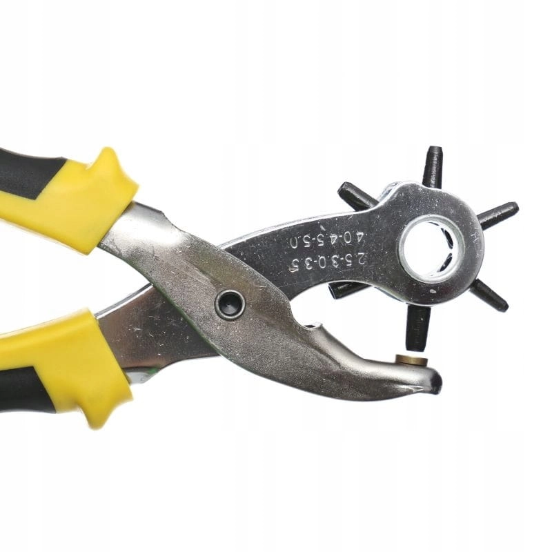 - Rewolwerowe szczypce obrotowe do dziurkowania o długości 220 mm. Do robienia dziurek o średnicy: 2,5 mm, 3 mm, 3,5 mm, 4 mm, 4,5 mm i 5 mm. Szczypce przeznaczone są do robienia otworów w filcu, skórze, tekstyliach, foliach z tworzywa sztucznego, tekturze i w innych.