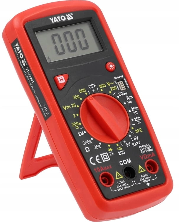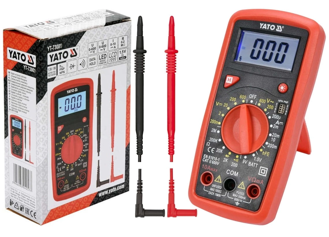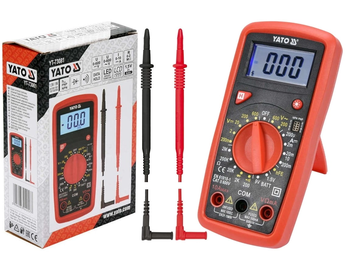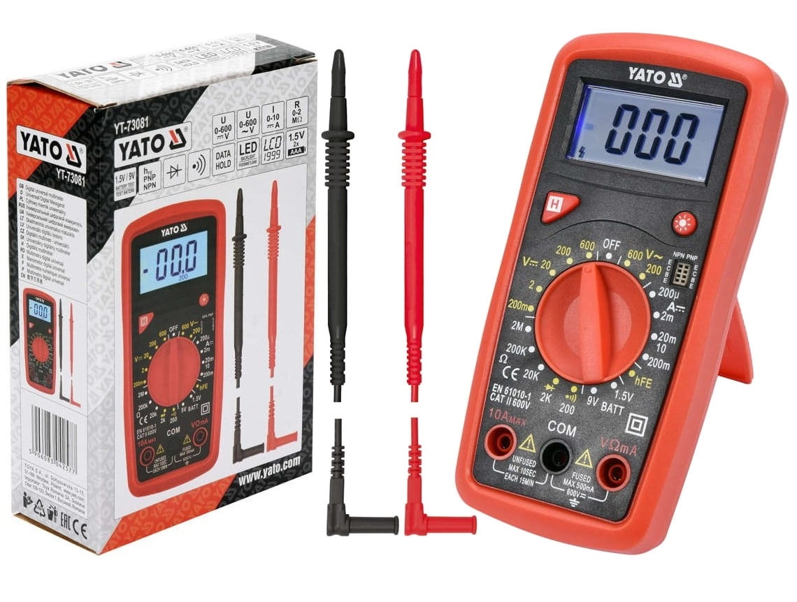 Miernik uniwersalny YT-73081 z ręcznym zakresem dla każdego pomiaru umożliwia wykonanie podstawowych oraz zaawansowanych pomiarów elektrycznych. Dodatkową i przydatną opcją jest test baterii 1,5V i 9V za pomocą którego możemy sprawdzić napięcie badanej baterii pod obciążeniem, pomoże to ocenić jej stan oraz wykluczyć lub potwierdzić konieczność wymiany.