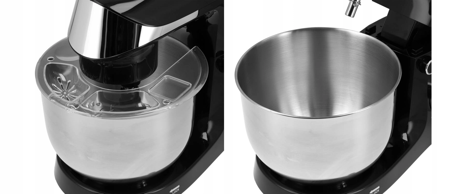 W zestawie znajduje się solidna misa o pojemności 4 litrów, wykonana z wysokogatunkowej stali nierdzewnej SS 304. Jest to materiał bezpieczny w kontakcie z żywnością, neutralny dla smaku i łatwy w czyszczeniu.