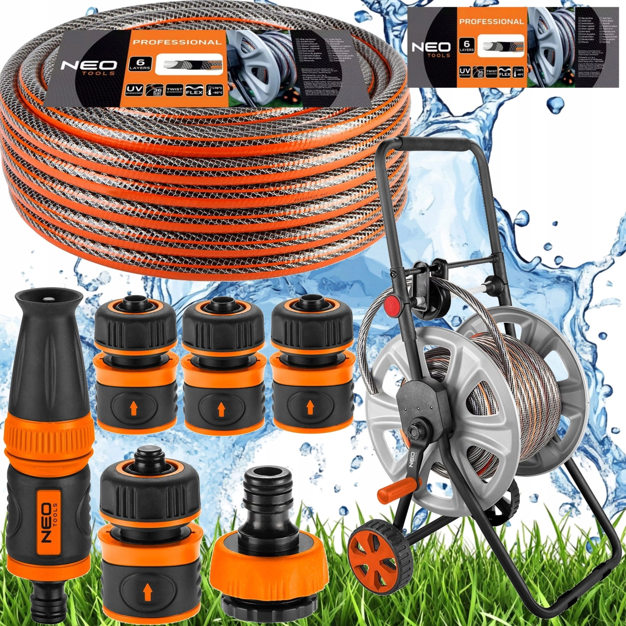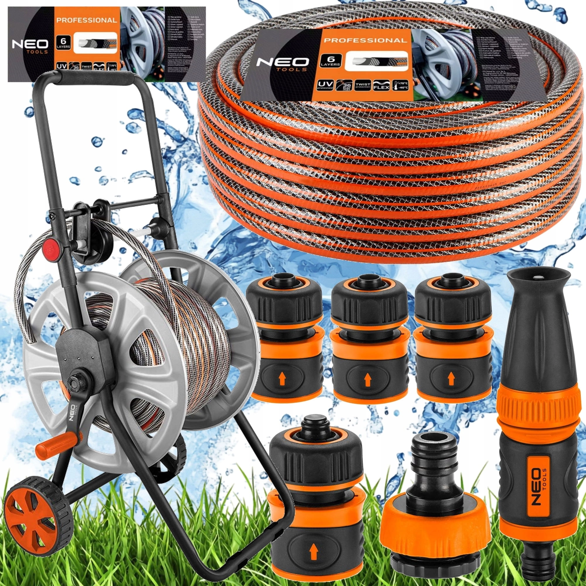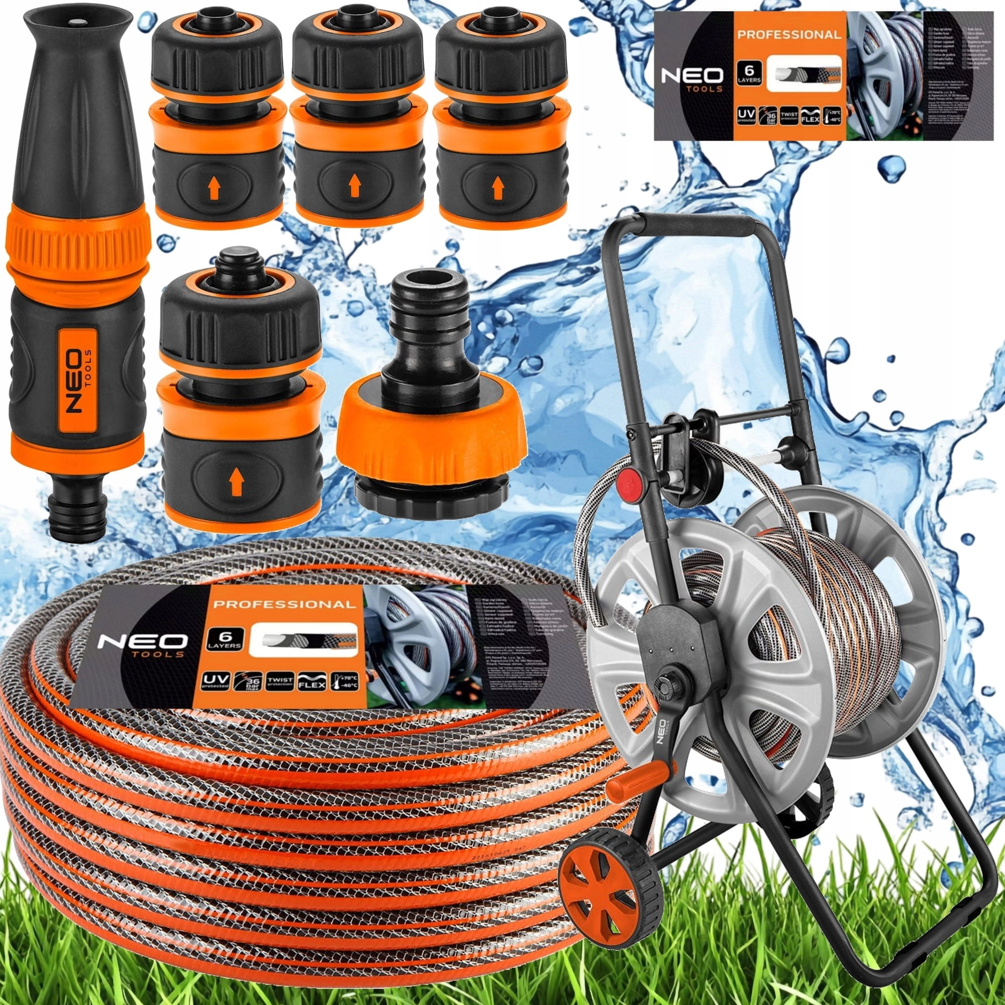 NEO WĄŻOGRODOWY 6 WARSTWOWY 50M 1/2" NA BĘBNIE ZRASZACZ ZŁĄCZKI ZESTAW