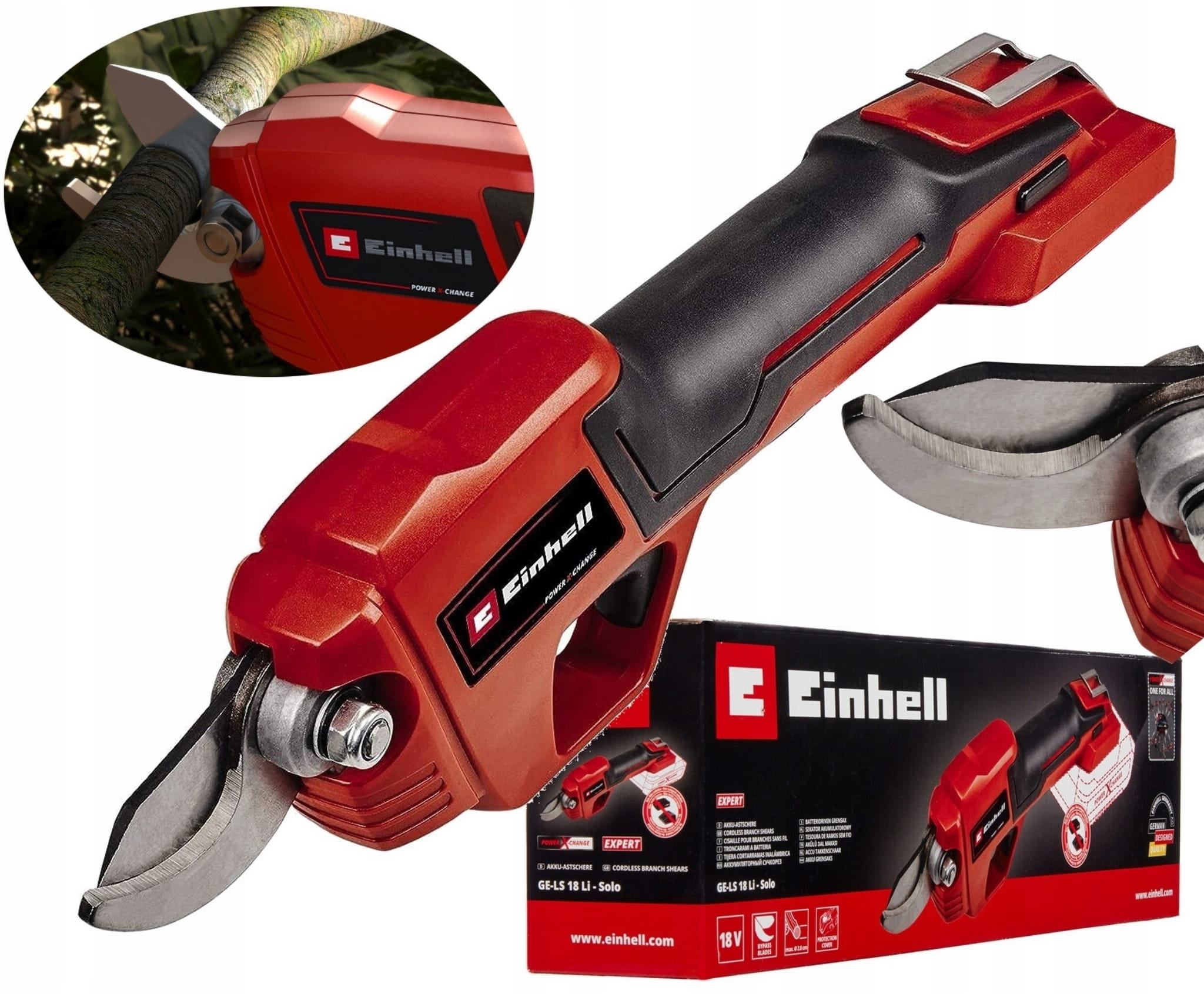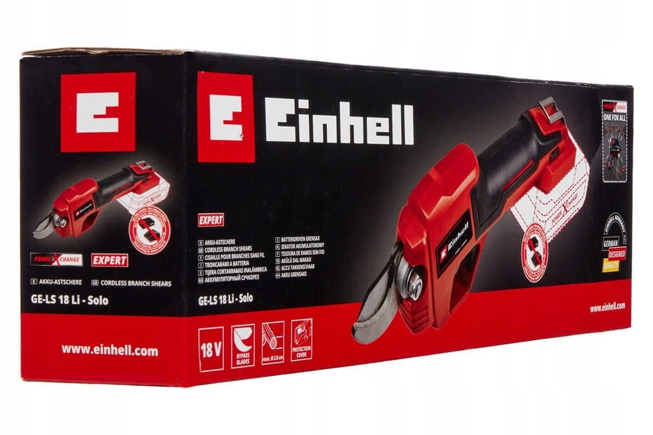 Akumulatorowe nożyce do gałęzi GE-LS 18 Li marki Einhell Power X-Change dostarczane są bez akumulatora i ładowarki. Pasują do nich wszystkieakumulatory z serii Power X-Change.