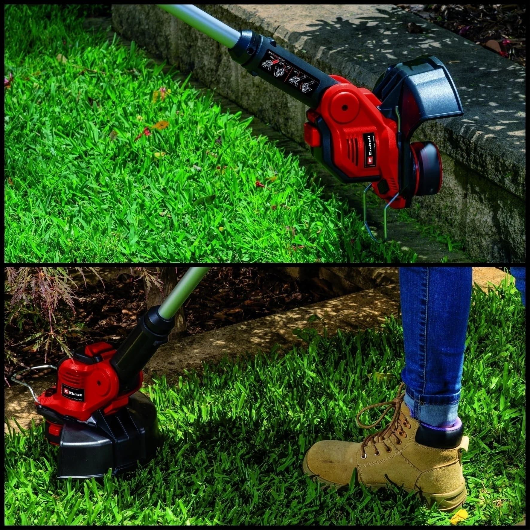 - Głowica silnika obracana o 180°: Do powierzchni pionowych/ krawędzi trawnika