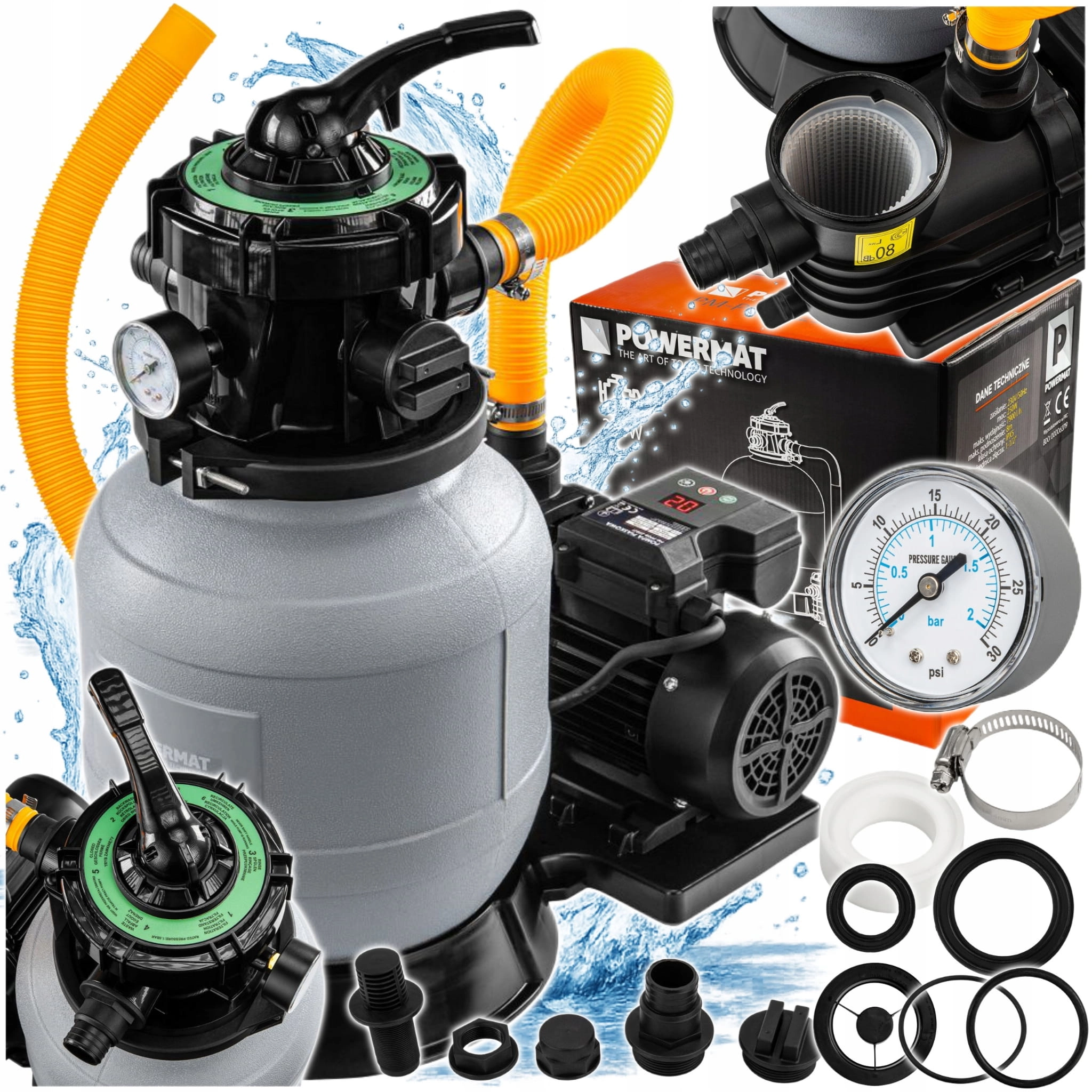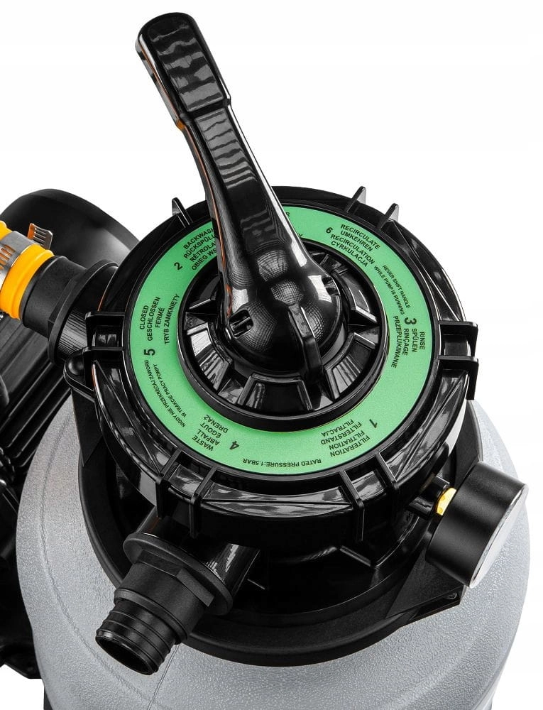 Pompa pracuje z piaskiem kwarcowym 0,5–1,2 mm lub kulkami filtracyjnymi 400 g, więc łatwiej dopasujesz filtrację do swoich potrzeb. Do tego manometr i 7 trybów pracy dają Ci konkretną kontrolę nad całym układem.