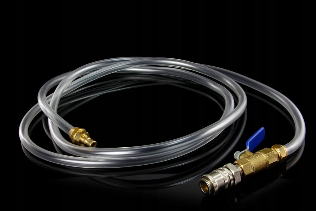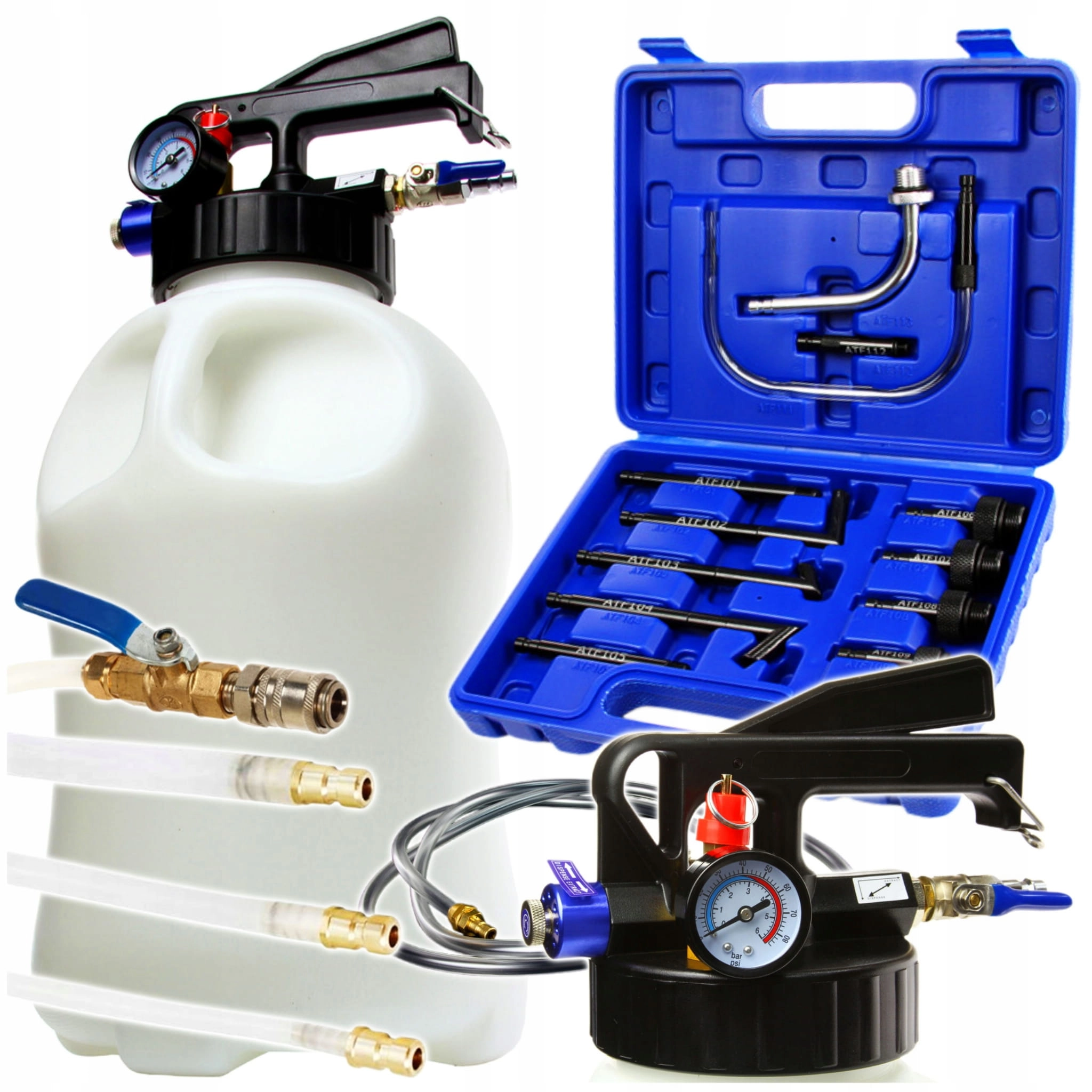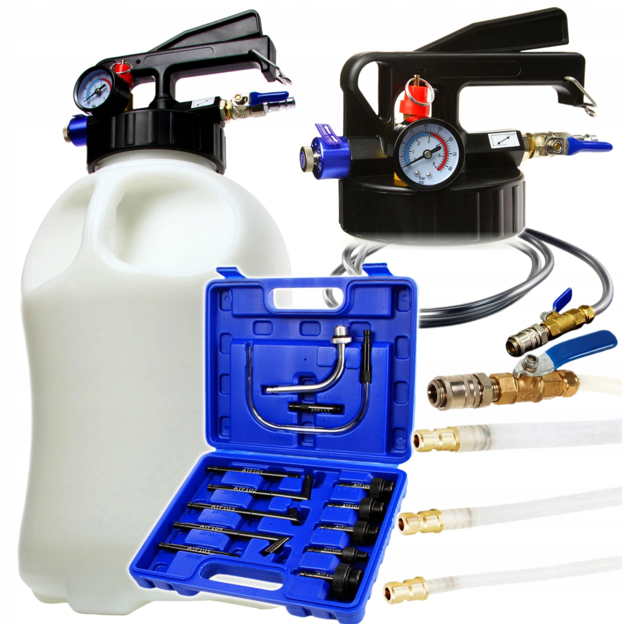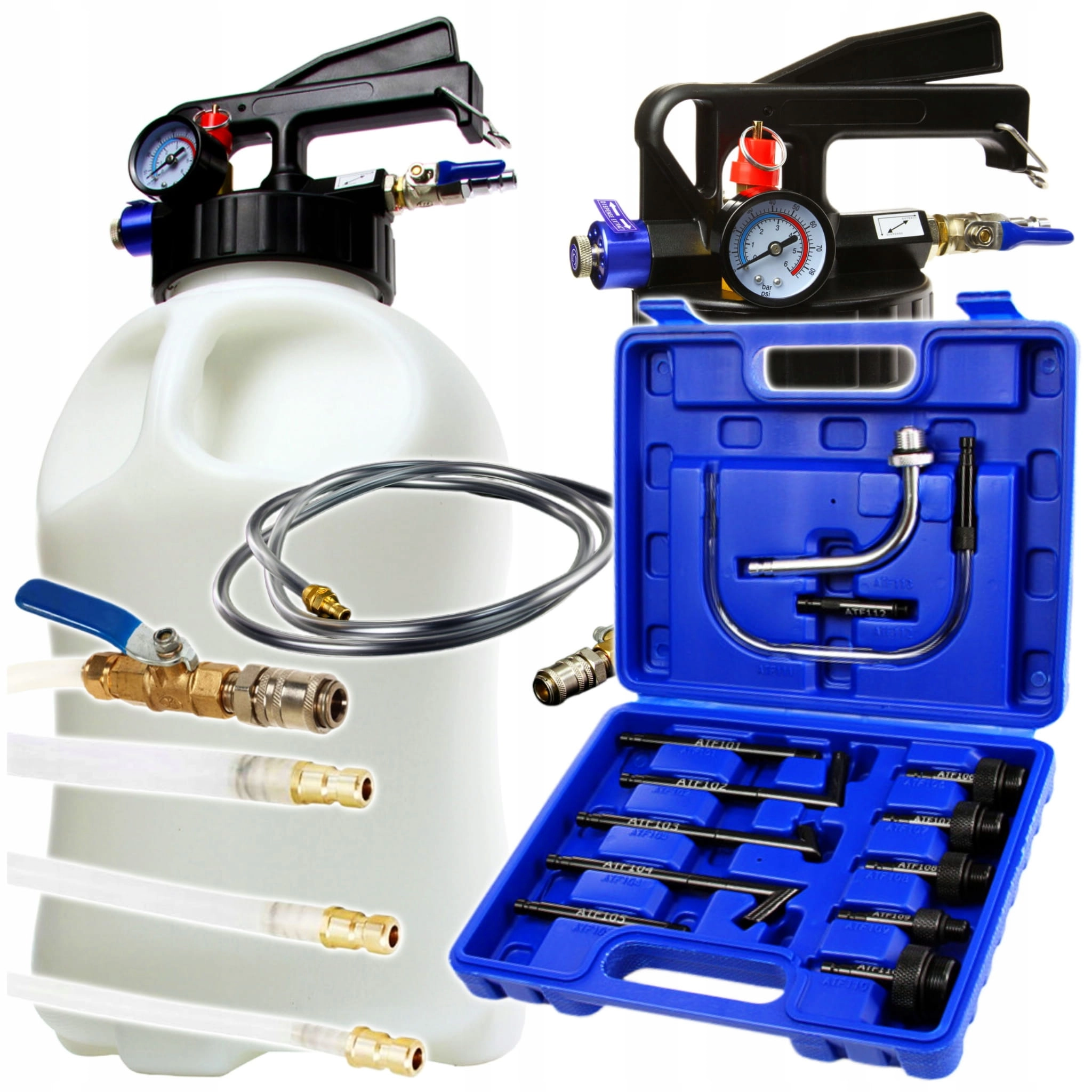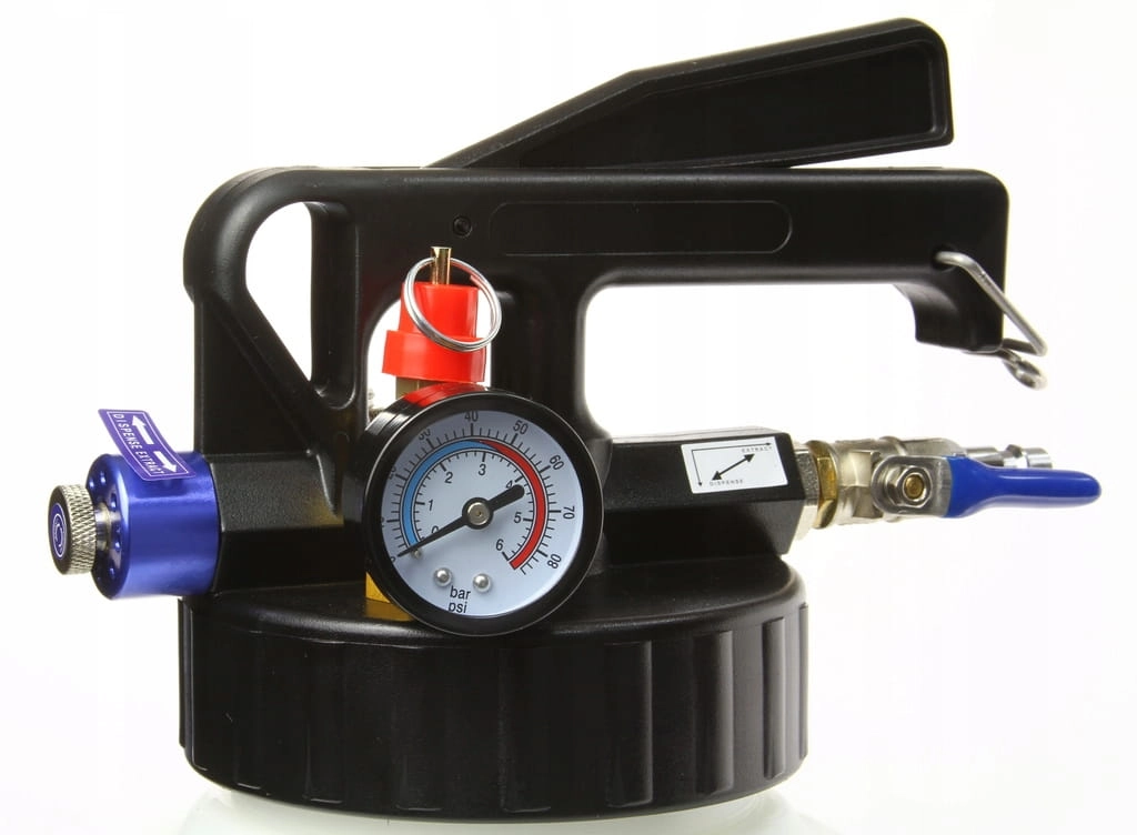 Zbiornik ciśnieniowy służy do opróżniania i napełniania olejem automatycznych skrzyń biegów i mechanizmów różnicowych. Zbiornik o pojemności 10 litrów. Wyposażony w zawór bezpieczeństwa. Manometr pozwala na monitorowanie ciśnienia w zbiorniku. Wyposażony w dwukierunkowy zawór. Regulacja przepływu płynu za pomocą zaworów kulowych. Dźwignia z możliwością zablokowania w pozycji włączonej. Przewód główny 200 cm z zaworem kulowym i szybkozłączem. Transparentna nylonowa rurka 8x10mm o długości 100 cm (temp. pracy od -40 do 120°C, ciśnienie pracy: do 2.8 MPa). Rurka nylonowa 4x6mm o długości 80 cm w połowie pokryta giętkim gumowym kołnierzem, zakończona szybkozłączem (temp. pracy od -40 do 125°C, ciśnienie pracy: do 2.8 MPa).