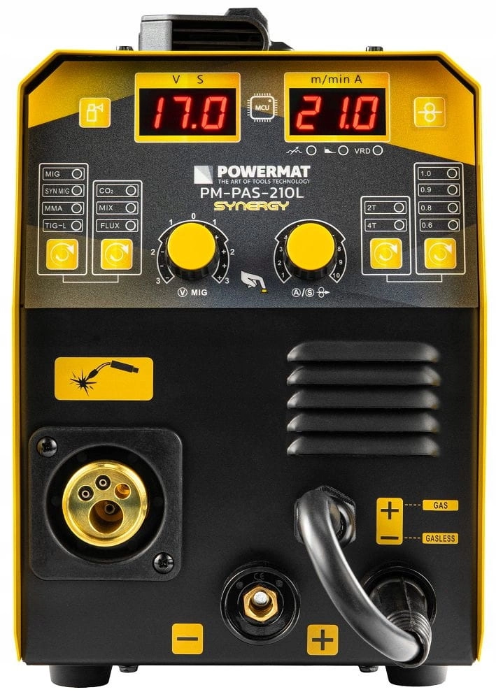 MIG/MAG / MMA / TIG LIFT / FLUX | PRĄD SPAWANIA 210A | SYNERGIA | ZASILANIE 230V | TECHNOLOGIA IGBT | DRUT 0,6–1,0 MM | ELEKTRODY 1,6–5,0 MM | LCD