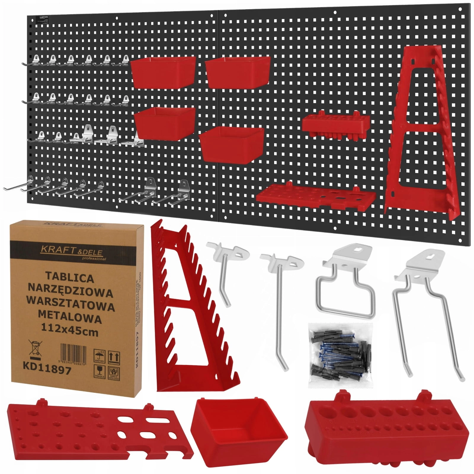 - ✔️Rozbudowany zestaw akcesoriów – liczne haki, uchwyty i pojemniki pozwalają na uporządkowanie różnorodnych narzędzi