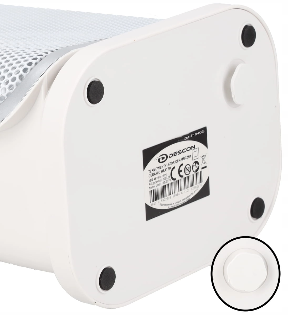 - Pokrętło ustawienia mocy – wybierz tryb pracy: chłodny nawiew, grzanie 750 W lub grzanie 1500 W