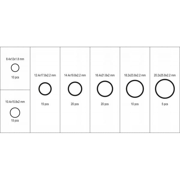 Zestaw 95 sztuk podkładek miedzianych dmuchanych w siedmiu rozmiarach. Całość zapakowana w poręczne plastikowe pudełko z przegrodami zapewniającymi porządek i prawidłową segregację rozmiarów podkładek.