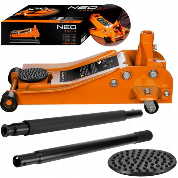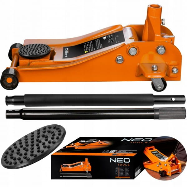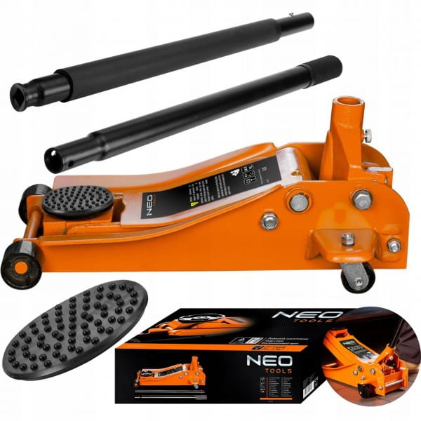 Podnośnik hydrauliczny niskoprofilowy NEO (nr ref. 11-731) typu żaba, posiada 2-skrętne koła ułatwiające manewrowanie. Zakres podnoszenia do 455 mm, maksymalny ciężar 2.5 t. Podnośnik wyróżnia się specjalnym profilem ułatwiającym podnoszenie samochodów o małym prześwicie. Zgodność z europejskimi standardami bezpieczeństwa zapewnia certyfikat CE. Gwarantem wysokiej jakości i niezawodności produktu jest certyfikat TÜV Rheinland. Marka NEO spełnia oczekiwania profesjonalistów.
