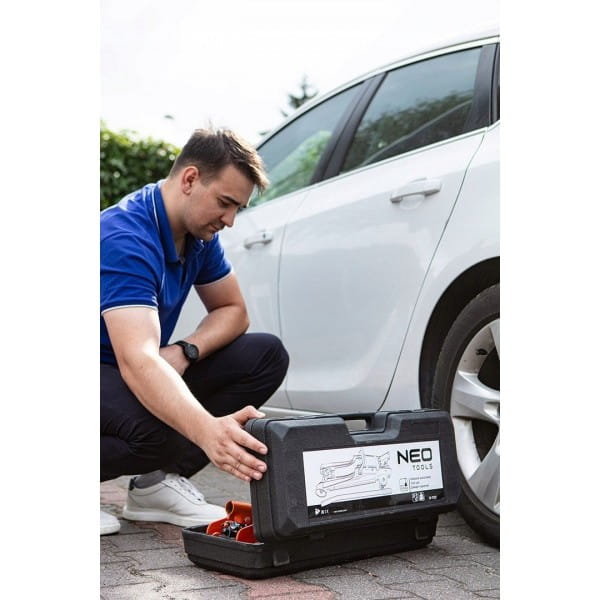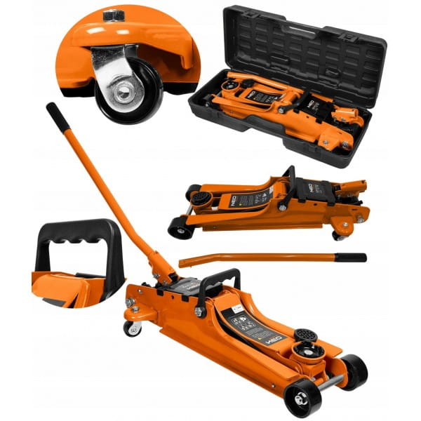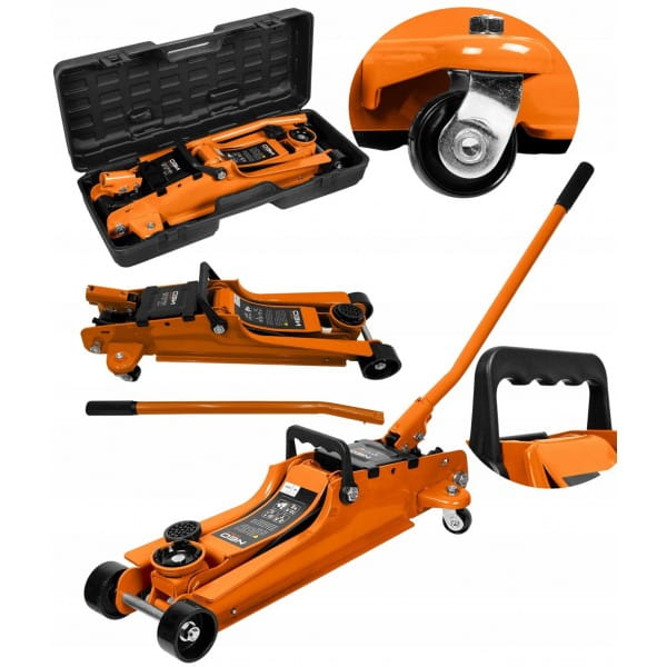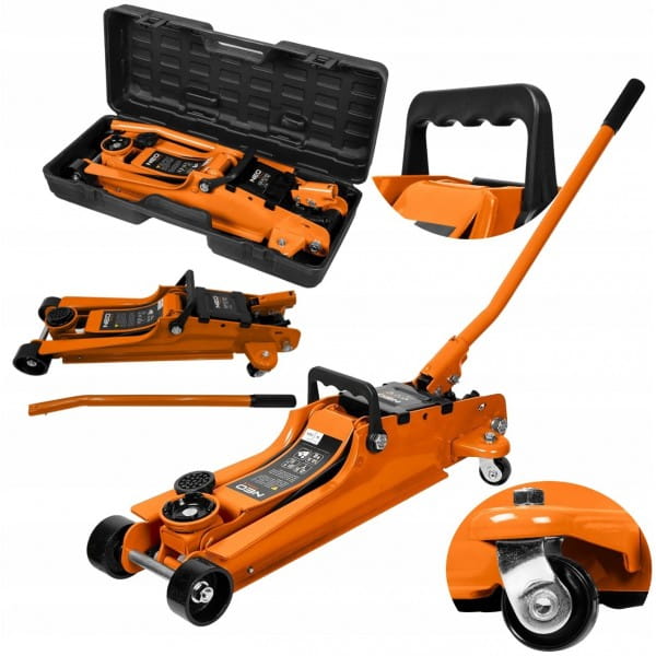 Podnośnik warsztatowy, żaba 2,5 T, 11-733 marki NEO TOOLS to podnośnik przeznczony do podnoszenia pojazdów do 2,5 tony. Charakteryzuje się zakresem podnoszenia od 85 do 385 mm, zapewniając łatwe mieszczenie się pod progiem. Jego masa całkowita wynosi 12,5 kg. Podnośnik NEO TOOLS wyposażony został w praktyczne cztery kółka (w tym dwa skrętne), ułatwiające transport. Solidna stalowa konstrukcja sprzyja z kolei wieloletniemu użytkowaniu. Niewielka wysokość początkowa narzędzia umożliwia wsunięcie podnośnika pod każde auto, a uchwyt do przenoszenia ułatwia jego obsługę. Podnośnik oferowany jest w zestawie z walizką z tworzywa.