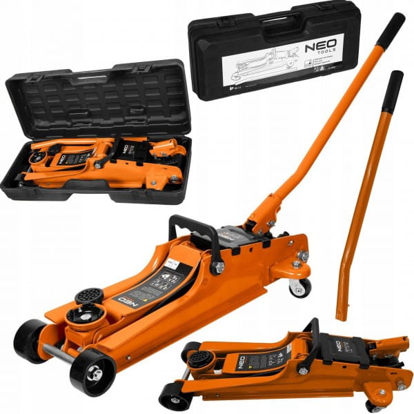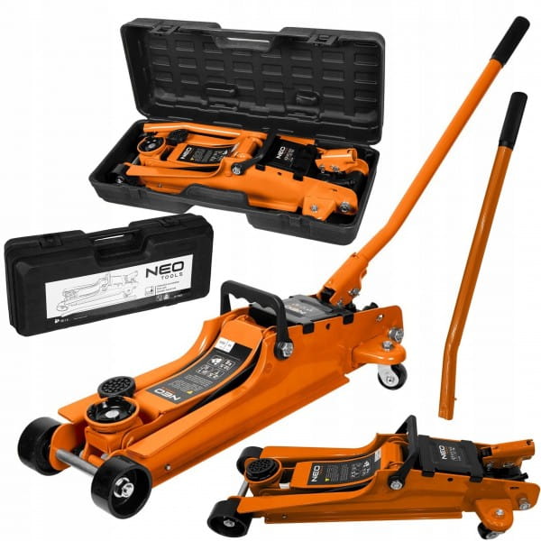 Wyjątkową cechą tego podnośnika NEO TOOLS jest niewielka wysokość początkowa i łatwe wsunięcie pod próg, co pozwala na swobodne użytkowanie go pod każdym autem. Dzięki uchwytowi do przenoszenia jest jeszcze bardziej komfortowy w obsłudze.