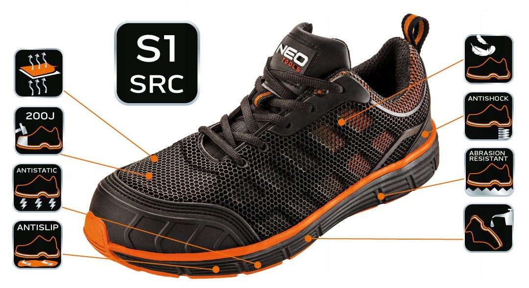 • NEO BUTY ROBOCZE OCHRONNE ODDYCHAJĄCE S1 STALOWY PODNOSEK 200J 82-097 r. 46
