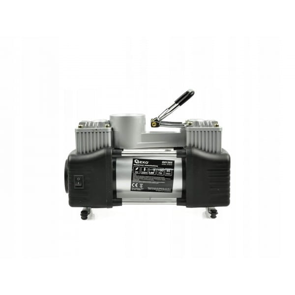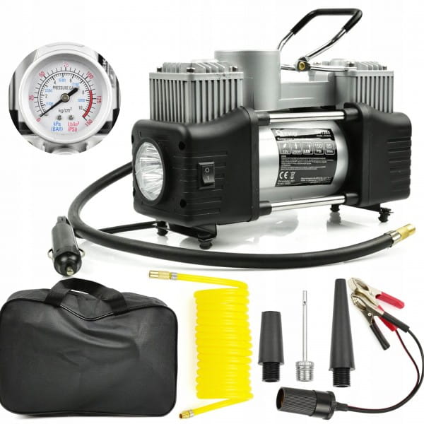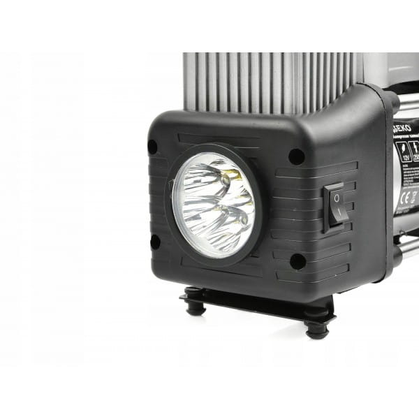 Kompresor samochodowym 250W zasilany napięciem 12-13,5V z gniazda zapalniczki lub bezpośrednio z akumulatora. Wyposażony w czytelny manometr ze stalą w 3 jednostkach: Bar, PSI oraz kg/cm2. Posiada nakręcaną końcówkę przystosowaną do wentyli samochodowych, które stosowane są również w motocyklach oraz rowerach. Wbudowana latarka umożliwia komfortowe korzystanie z kompresora w nocy, bez konieczności posiadania dodatkowego źródła światła. Dodatkowo w zestawie znajduje się pneumatyczny wąż spiralny oraz komplet 3 końcówek do pompowania piłek, materacy itp.