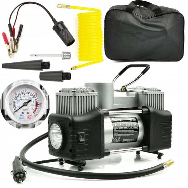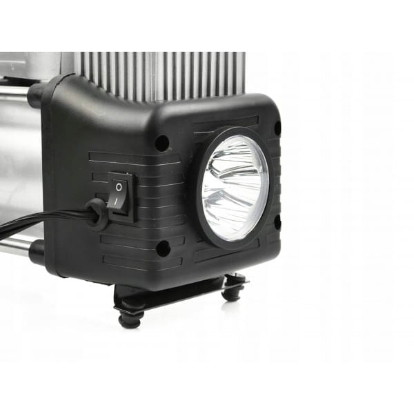 Kompresor samochodowym 250W zasilany napięciem 12-13,5V z gniazda zapalniczki lub bezpośrednio z akumulatora. Wyposażony w czytelny manometr ze stalą w 3 jednostkach: Bar, PSI oraz kg/cm2. Posiada nakręcaną końcówkę przystosowaną do wentyli samochodowych, które stosowane są również w motocyklach oraz rowerach. Wbudowana latarka umożliwia komfortowe korzystanie z kompresora w nocy, bez konieczności posiadania dodatkowego źródła światła. Dodatkowo w zestawie znajduje się pneumatyczny wąż spiralny oraz komplet 3 końcówek do pompowania piłek, materacy itp.