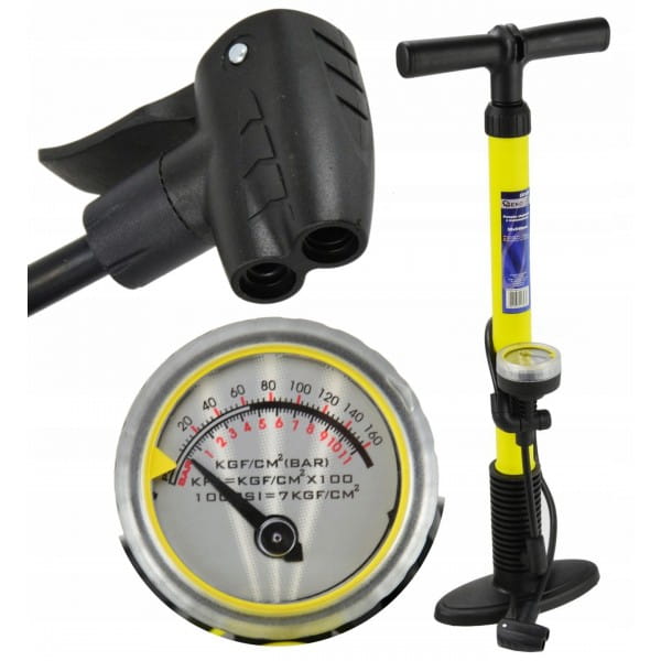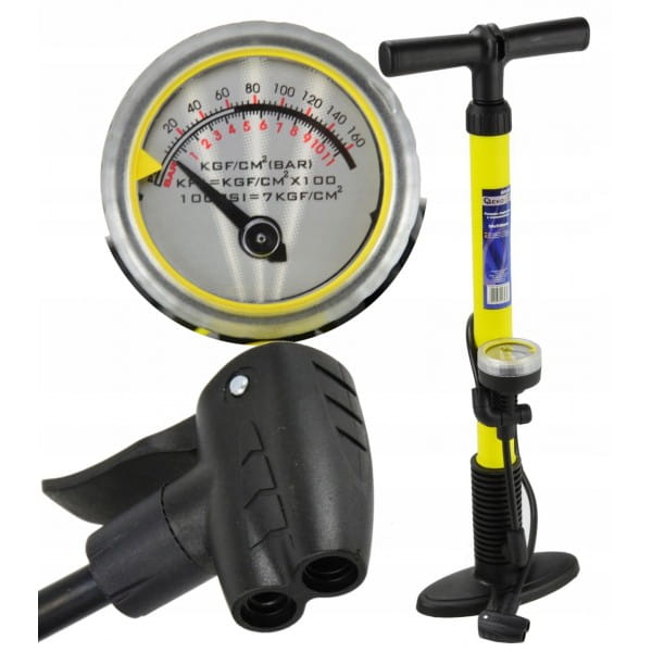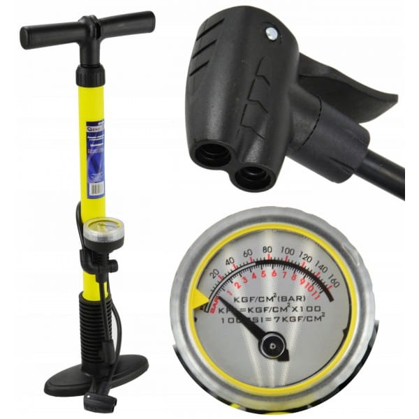 Mocna i trwała pompka słupkowa z uniwersalnym zaciskiem na wentyle.
