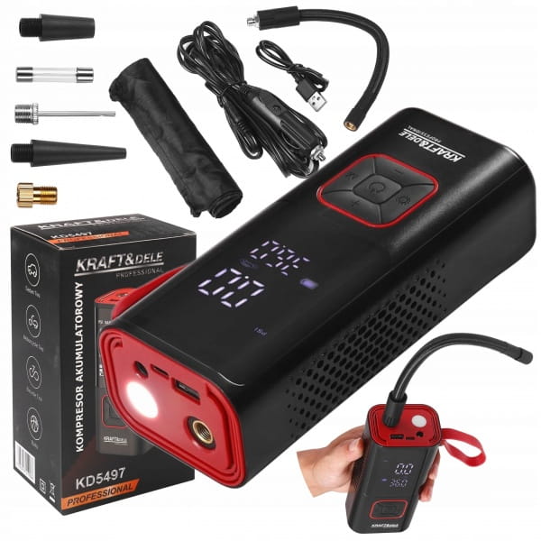 KD5497 to nowoczesny, przenośny kompresor akumulatorowy marki KRAFT&DELE, zaprojektowany z myślą o szybkim i wygodnym pompowaniu opon, piłek, materacy czy innych akcesoriów. Dzięki wbudowanemu akumulatorowi o łącznej pojemności 7800mAh oraz funkcji latarki LED, urządzenie doskonale sprawdzi się zarówno w warsztacie, jak i podczas podróży.