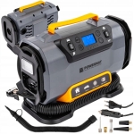 Kompresor osiąga maksymalne ciśnienie 10 bar (150 PSI) i oferuje wydajność pompowania 35 l/min, co umożliwia sprawne napełnianie opon i akcesoriów.