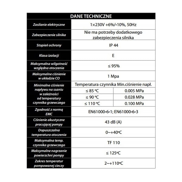 - ️Maksymalne nagrzanie powierzchni pompy: 125°C