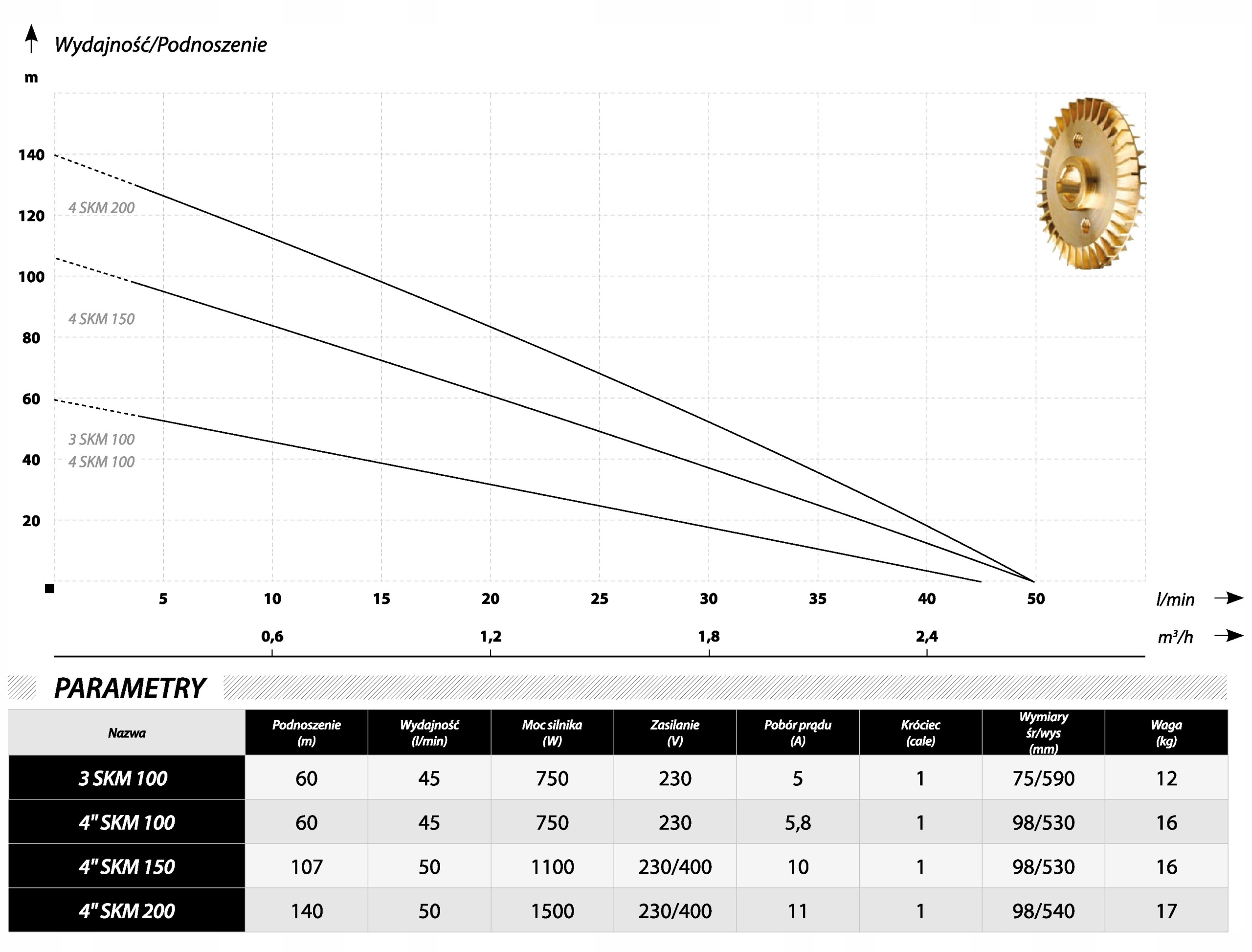 Pompa głębinowa o symbolu SKM 200 i średnicy 4 cali, jest urządzeniem o maksymalnej wydajności 50 litrów na minutę i ciśnieniu maksymalnym 6 atmosfer. Ciśnienie jest wystarczające, aby tłoczyć wodę z ujęcia o lustrze położonym na głębokości około 20 metrów i zasileniu nią nawet 2 zraszaczy. Musimy jednak pamiętać, że podane wartości maksymalne nie uwzględniają oporu związanego z tłoczeniem wody – im wyżej tłoczymy wodę, tym ciśnienie ostateczne jest mniejsze.