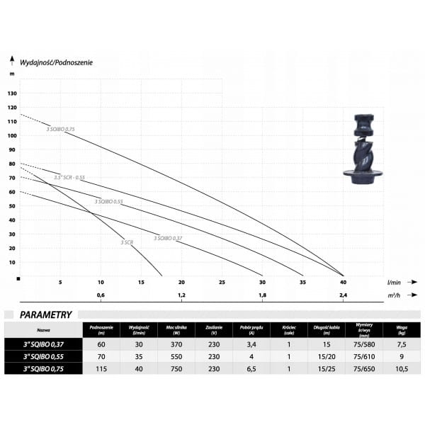 Wyporowe pompy głębinowe o średnicy 76mm. Pompy w głównej mierze wykonane zostały ze stali nierdzewnej np. obudowa, śruby, króćce oraz rotor. Pompy wyposażone zostały w różnej długości przewody elektryczne zakończone wtyczką w zależności od potrzeb użytkownika. Dzięki zabudowaniu kondensatora w silniku, od razu po rozpakowania pompa jest gotowa do montażu. Pompa wyposażana została w zabezpieczenie termiczne zamontowane w uzwojeniu silnika. Pompy z serii SQIBO są jednymi z najpopularniejszych pomp śrubowych na polskim rynku. Uznanie klientów zyskały dzięki solidnej konstrukcji i atrakcyjnej cenie.