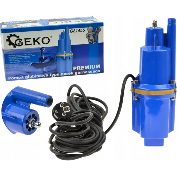 Pompa głębinowa zatapialna GEKO Premium 280W przeznaczona do podawania wody pitnej z dowolnych akwenów oraz otworów wiertniczych w kształcie walca o średnicy ponad 100mm z głębokości do 40m