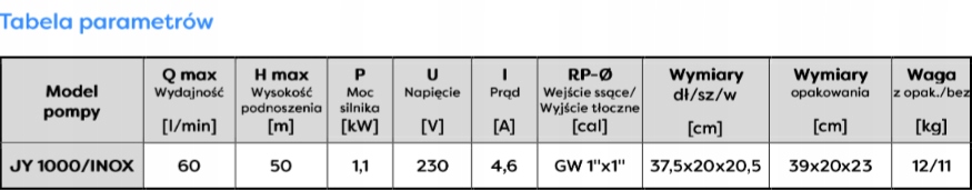 Pompa hydroforowa JY 1000 przeznaczona jest do zaopatrywania w słodką, zimną czystą wodę pod ciśnieniem. Pompa hydroforowa JY 1000 służy do dostarczania wody z ujęć studziennych lub innych źródeł zarówno do budynków mieszkalnych, jak i obiektów gospodarczych, działkowych. Znakomicie spełni swoją rolę przy nawadnianiu. Oferowana w dwóch wersjach wykonania.