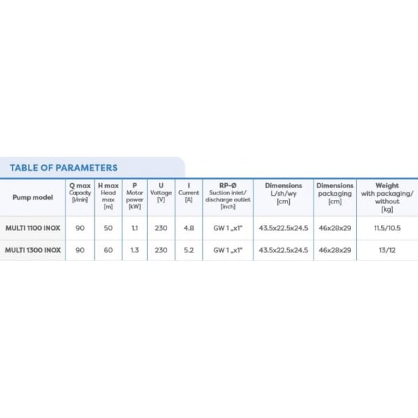 ZASTOSOWANIE: Nawierzchniowe pompy wielostopniowe Multi HWA, Multi 1100 i 1300 Inox przeznaczone są do zaopatrywania w wodę domów jedno i wielorodzinnych, gospodarstw rolnych. Znajdują również zastosowanie na działkach, w ogrodnictwie. Pompy te są pompami samozasysającymi które przeznaczone są do pompowania czystej, zimnej wody