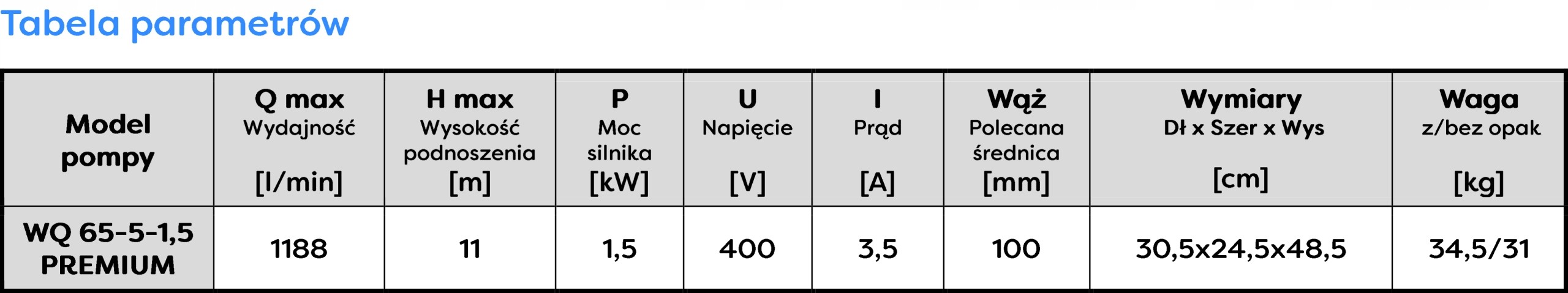 ZASTOSOWANIE: WQ 65-5-1,5 to potężna pompa zatapialna o dużej wydajności do ścieków, gnojowicy, wody z obecnością zanieczyszczeń włóknistych, oraz czystej, zimnej wody. Pompa ma bardzo szerokie zastosowanie, może z być stosowana zarówno w rolnictwie, agroturystyce jak i przedsiębiorstwach komunalnych czy oczyszczalniach ścieków. Pompa jest przystosowana do pracy ciągłej w trudnych warunkach. WQ 65-5-1,5 z powodzeniem może być stosowana jako pompa do szamba, odwodnienia rowów melioracyjnych i zbiorników ściekowych czy przepompowaniu wody ze stawu. W naszej ofercie znajdują się produkty uzupełniające do tego modelu takie jak: węże tłoczne, urządzenia sterująco zabezpieczające - SMART oraz stopa sprzęgająca