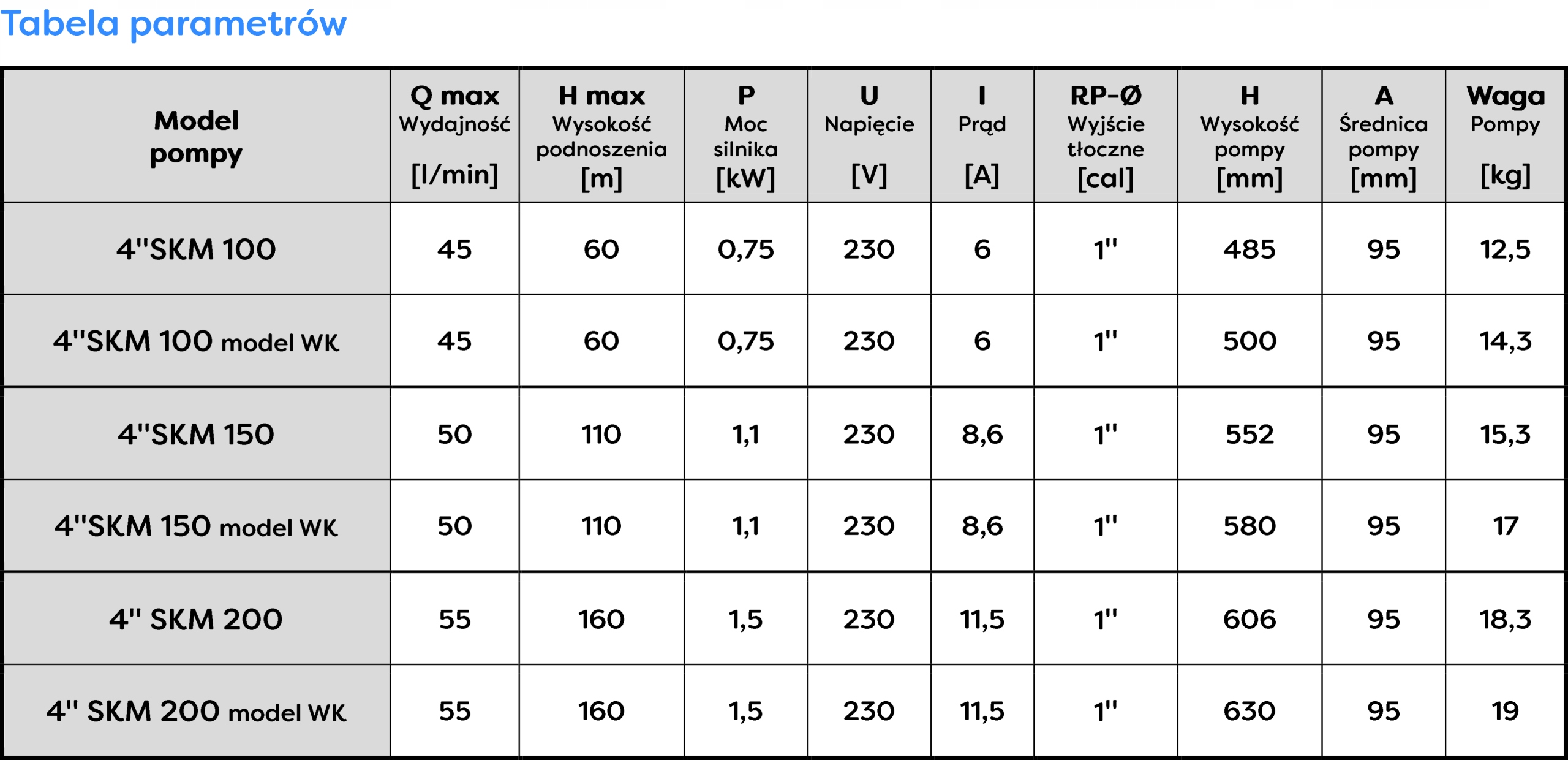 Pompy głębinowe 4" SKM z hydrauliką o budowie peryferalnej, przeznaczone są do tłoczenia czystej, zimnej, słodkiej wody z odwiertów głębinowych oraz innych zbiorników. Pompy 4"SKM   przeznaczone są do zastosowań wszędzie tam gdzie ich parametry hydrauliczne i techniczne są właściwe i zgodne z oczekiwaniami użytkownika.
