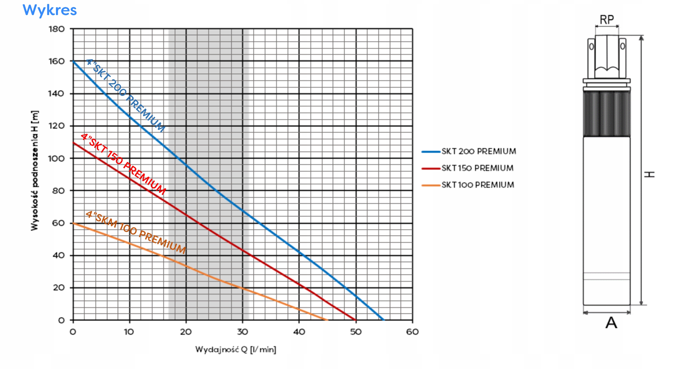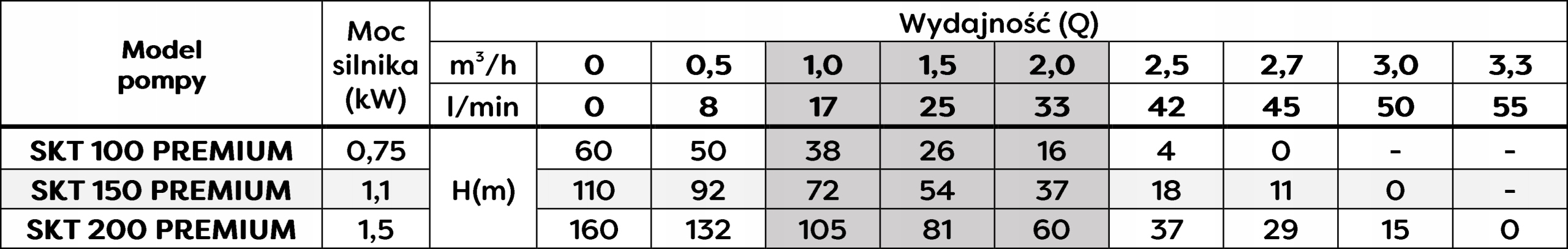 Pompy głębinowe 4" SKT z hydrauliką o budowie peryferalnej, przeznaczone są do tłoczenia czystej, zimnej, słodkiej wody z odwiertów głębinowych oraz innych zbiorników. Pompy 4"SKT przeznaczone są do zastosowań wszędzie tam gdzie ich parametry hydrauliczne i techniczne są właściwe i zgodne z oczekiwaniami użytkownika.