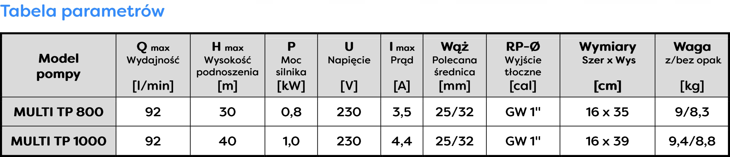 ZASTOSOWANIE: Wielostopniowa pompa zatapialna przeznaczona do czerpania słodkiej, czystej, zimnej wody ze studni kręgowych i zbiorników wielkogabarytowych. Konstrukcja pompy, powoduje wymuszenie chłodzenia poprzez przepływającą wzdłuż silnika wodę. Dzięki takiemu rozwiązaniu pompa może okresowo pracować w stanie niecałkowitego zanurzenia. Sterowanie pracą MULTI TP 1000 odbywa się automatycznie za pomocą sterownika pływakowego (tzw. pływaka). Zakres parametrów hydraulicznych w tym wytwarzanego wysokiego ciśnienia i łatwość montażu pompy pozwala na zastosowanie jej do podlewania, zaopatrzenia w wodę domów jednorodzinnych, domków letniskowych, do nawadnia ogrodów i niezbyt dużych obszarów rolnych