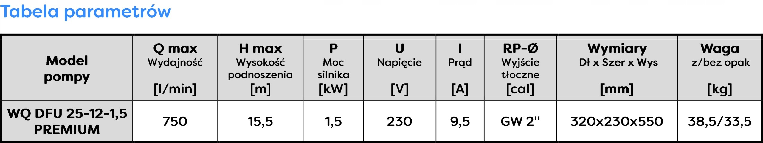 WQ DFU25-12-1,5PREMIUM pompy zanurzeniowe do najtrudniejszych warunków pracy jak odwodnienie wykopów, rowów melioracyjnych, pompowania szlamu, błota, ścieków bytowych i brudnej wody. Pompy dedykowane dla potrzeb budownictwa, inżynierii lądowej, oczyszczalni ścieków. Konstrukcja pompy została opracowana tak aby jej uzwojenie było chłodzone przez medium płynące bocznym kanałem tłocznym wzdłuż silnika. Zaletą takiego rozwiązania jest skuteczne chłodzenie silnika nawet przy małym przepływie oraz możliwość ciągłej pracy w stanie niecałkowitego zanurzenia. Króciec tłoczny umieszczony jest pionowo na pokrywie górnej. Pompa posiada sterowanie pływakowe które steruje jej załączaniem się w zależności od poziomu pompowanego medium i chroni pompę przed pracą na sucho