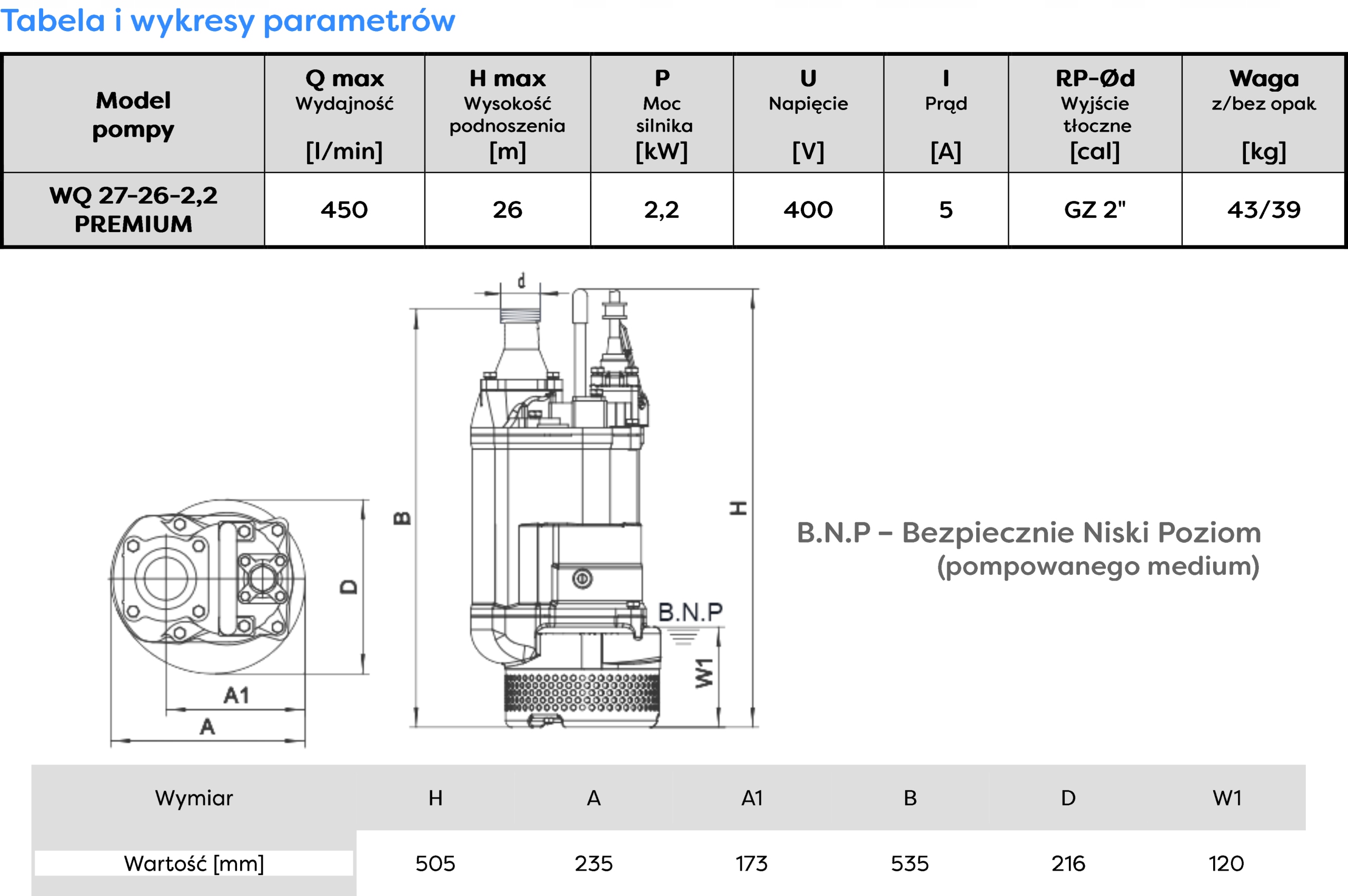 WQ 27-26-2,2 PREMIUM pompy zanurzeniowe do najtrudniejszych warunków pracy jak odwodnienie wykopów, rowów melioracyjnych, pompowania szlamu, błota, ścieków bytowych i brudnej wody. Pompy dedykowane dla potrzeb budownictwa, inżynierii lądowej, oczyszczalni ścieków, kopalni i kamieniołomów. Konstrukcja została opracowana tak, aby uzwojenie było chłodzone przez medium płynące bocznym kanałem tłocznym wzdłuż silnika. Zaletą takiego rozwiązania jest skuteczne chłodzenie silnika nawet przy bardzo małym przepływie oraz możliwość ciągłej pracy w stanie niecałkowitego zanurzenia. Króciec tłoczny umieszczony jest pionowo na pokrywie górnej, rozwiązanie takie umożliwia zredukowanie masy i wymiarów zewnętrznych pompy co ułatwia jej montaż nawet w trudno dostępnych miejscach