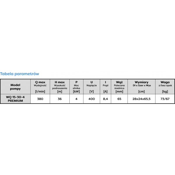 Zatapialna pompa WQ 50-10-4 PREMIUM przeznaczona jest do tłoczenia wody brudnej, zimnej, słodkiej zanieczyszczonej cząstkami stałymi pochodzenia organicznego (bez elementów szlifujących). Pompa przydatna przy odwadnianiu terenu, usuwaniu wody szarej lub ściekowej ze studzienek, zbiorników.