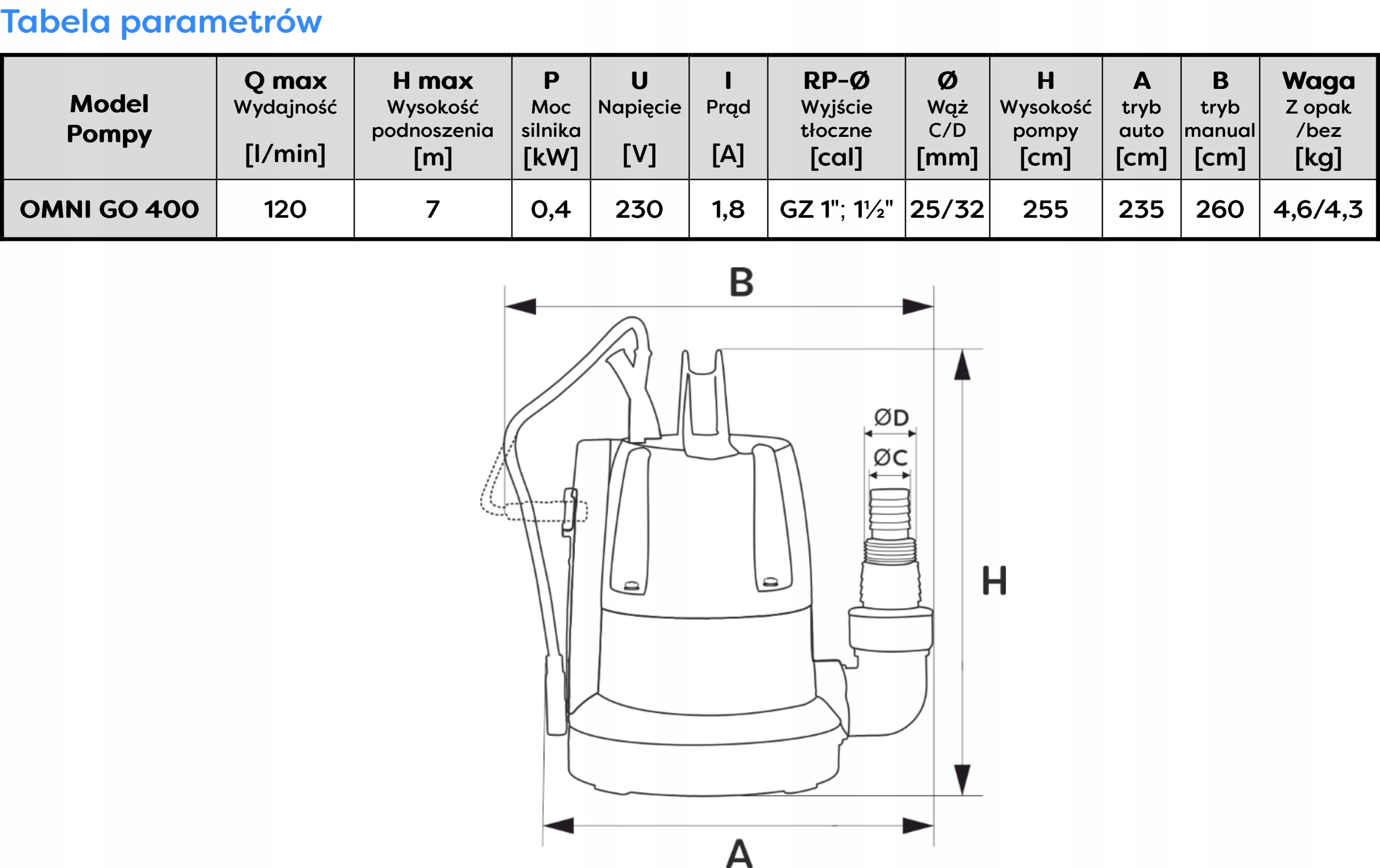 ⭐Zatapialna pompa do odwadniania OMNI GO 400 przeznaczona jest do tłoczenia czystej lub lekko zanieczyszczonej elementami pochodzenia organicznego (bez elementów szlifujących), zimnej, słodkiej wody.
