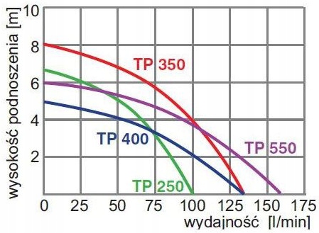 Pompa TP 550 przeznaczona jest do pompowania czystej, zimnej wody ze studni kręgowych i zbiorników oraz wody szarej zawierającej zanieczyszczenia o maksymalnej średnicy nie przekraczającej 35mm. Stosuje się ją również często do wypompowywania wody z zalanych pomieszczeń. Pompa posiada sterowanie pływakowe które w zależności od poziomu pompowanej cieczy steruje jej załączaniem i chroni przed pracą na sucho..