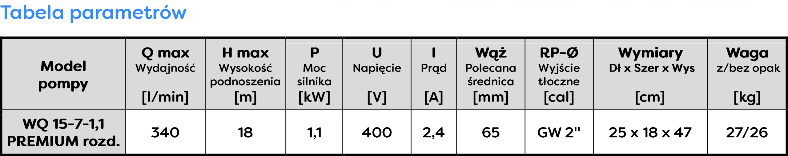Pompa zatapialna WQ 15-7-1,1 z rozdrabniaczem to pompa dedykowana do ścieków, gnojowicy, brudnej wody z obecnością zanieczyszczeń organicznych i bytowych. Pompa posiada wydajny system rozdrabniający który tnie pompowane medium na małe kawałki dzięki czemu instalacja nie zapycha się. Z powodzeniem może być stosowana jako pompa do odwodnienia zalanych pomieszczeń czy opróżniania zbiorników ściekowych. Obszar zastosowania: gospodarstwa domowe, agroturystyka, rolnictwo, przedsiębiorstwa komunalne. Model ten często stosowany jest przez producentów przydomowych oczyszczalni ścieków potwierdzając tym samym jakość i trwałość naszych produktów. W ofercie znajdują się produkty uzupełniające takie jak: węże tłoczne, urządzenia sterująco zabezpieczające SMART