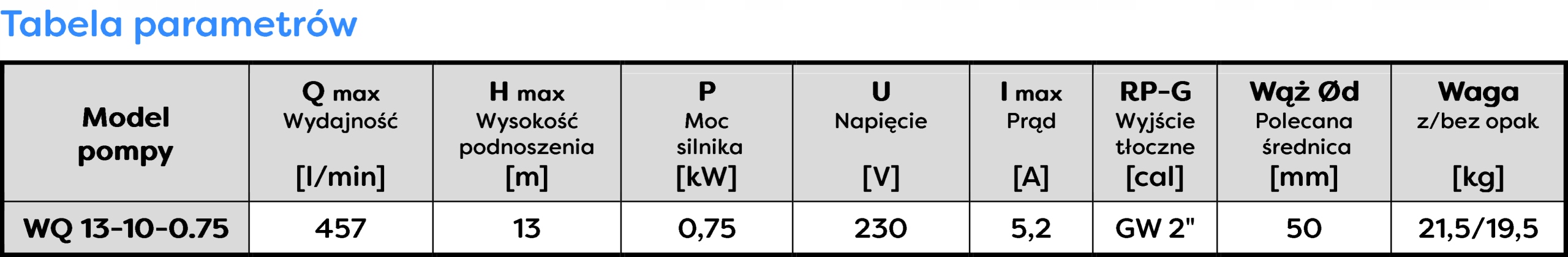 Pompa WQ 13-10-0,75 jest solidną pompą zatapialną przeznaczoną do pompowania czystej, zimnej wody, oraz wody deszczowej i szarej zawierającej zanieczyszczenia organiczne o maksymalnej średnicy nie przekraczającej 25mm. WQ 13-10-0,75 posiada sterowanie pływakowe które steruje jej załączaniem się w zależności od poziomu pompowanego medium i chroni pompę przed pracą na sucho. Zatapialne pompy typoszeregu WQ stosuje się do wypompowywania ścieków z szamba, wody z zalanych pomieszczeń, nawadniania lub przepompowywania wody ze zbiorników lub stawów. Obszar zastosowania: domostwa, agroturystyka, rolnictwo, przemysł. Model ten często stosowany jest przez producentów przydomowych oczyszczalni ścieków potwierdzając tym samym jakość i trwałość naszych produktów.