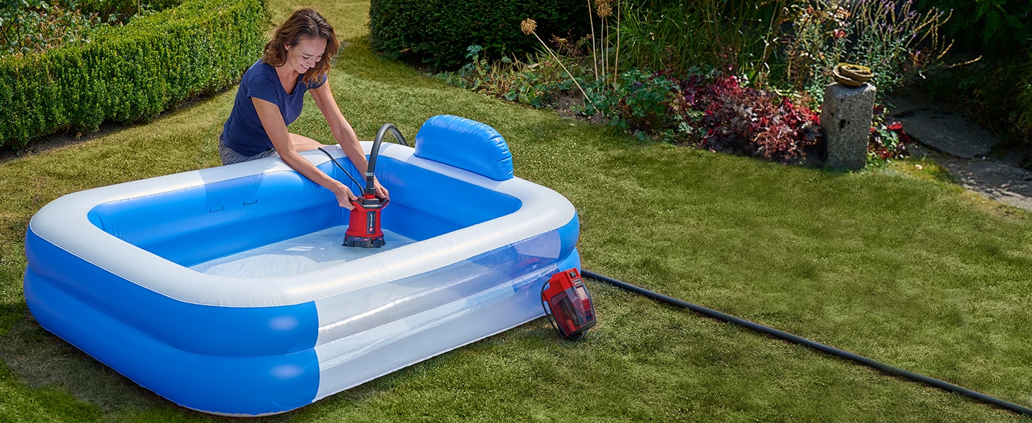 Dzięki obrotowej podstawie pompa akumulatorowa nadaje się zarówno do wody brudnej z cząstkami zanieczyszczeń nie większymi niż 25 mm, jak i wody czystej (wielkość cząstek 1 mm). Czystą wodę można wypompować za pomocą płaskiej pompy ssącej do poziomu wody resztkowej 1 mm. Poziom wody musi wynosić co najmniej 10 mm, aby pompa mogła się uruchomić. Dwustronny uchwyt do przenoszenia umożliwia łatwe przenoszenie lekkiego urządzenia o wadze 3,3 kg. Pompa jest wyposażona w przyłącze ciśnieniowe 42 mm (1 1/4” AG) i jest dostarczana z uniwersalnym adapterem do węży 25/32 mm z 1” AG (33,3 mm).