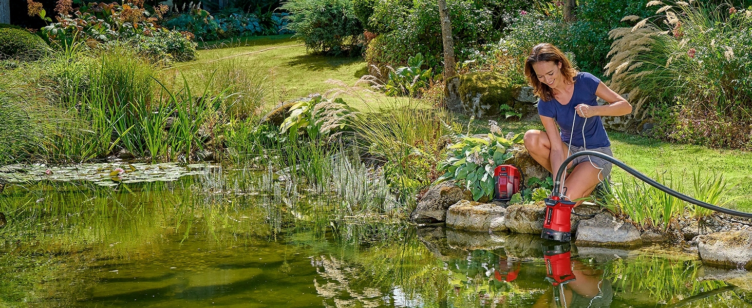 Płasko zasysająca pompa wodna jest częścią rodziny Einhell Power X-Change, w której akumulatory, ładowarki i urządzenia oparte na tym systemie można elastycznie ze sobą łączyć. Akumulator jest chroniony przez wodoszczelną, wytrzymałą skrzynkę akumulatorową i można go zawiesić na ścianach, beczkach na deszczówkę, płotach itp. dzięki uchwytowi ściennemu i haczykom mocującym.