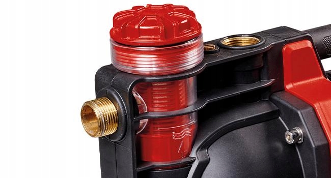 Przezroczysta obudowa wokół filtra wstępnego spełnia dwie funkcje: służy jako wskaźnik napełnienia wodą i jako wskaźnik zabrudzenia. Dzięki temu można sprawdzić, czy pompa została napełniona wodą oraz czy filtr nie jest zabrudzony i należy go wyczyścić.