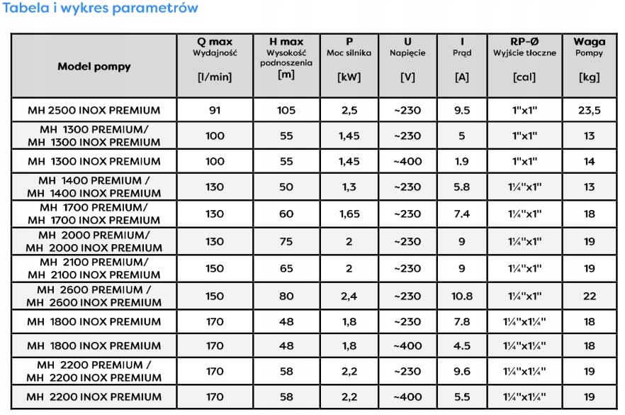 Pompy hydroforowe MH INOX PREMIUM przeznaczone są do zaopatrywania w słodką, zimną, czystą wodę pod ciśnieniem. Pompy hydroforowe MH INOX PREMIUM mogą służyć do dostarczania wody z ujęć studziennych lub innych źródeł zarówno do budynków mieszkalnych, jak i obiektów gospodarczych, działkowych. Przeznaczone są do zastosowań wszędzie tam, gdzie ich parametry hydrauliczne i techniczne będą właściwe i zgodne z oczekiwaniami użytkownika.