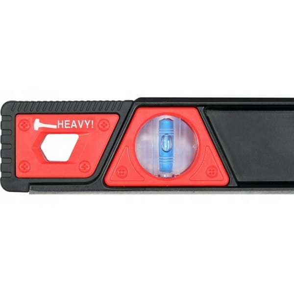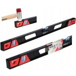 Końce poziomnicy, zabezpieczone elastycznymi odbojnikami odpornymi na uderzenia, umożliwiają pobijanie młotkiem.
