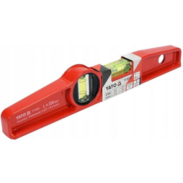 Powierzchnia poziomnicy jest zabezpieczona warstwą naniesionego proszkowo lakieru. Długość całkowita korpusu 250 mm.