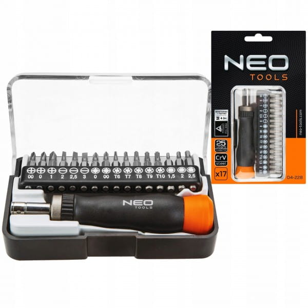 Zestaw wkrętaków precyzyjnych NEO (nr ref. 04-228) zawiera uchwyt i 16 końcówek wkrętakowych 30 mm (płaskich, krzyżowych, Torx i sześciokątnych). Magnetyczne końcówki wykonane są z wyjątkowo wytrzymałej stali chromowo-molibdenowej. Obrotowa nasadka w rękojeści umożliwia precyzyjnie dokręcanie śrub. Dwumateriałowy uchwyt odporny jest na działanie chemikaliów, olejów i smarów. Całość zapakowana jest w praktyczne etui. Gwarantem wysokiej jakości i niezawodności produktu jest certyfikat TÜV Rheinland. Marka NEO spełnia oczekiwania profesjonalistów.