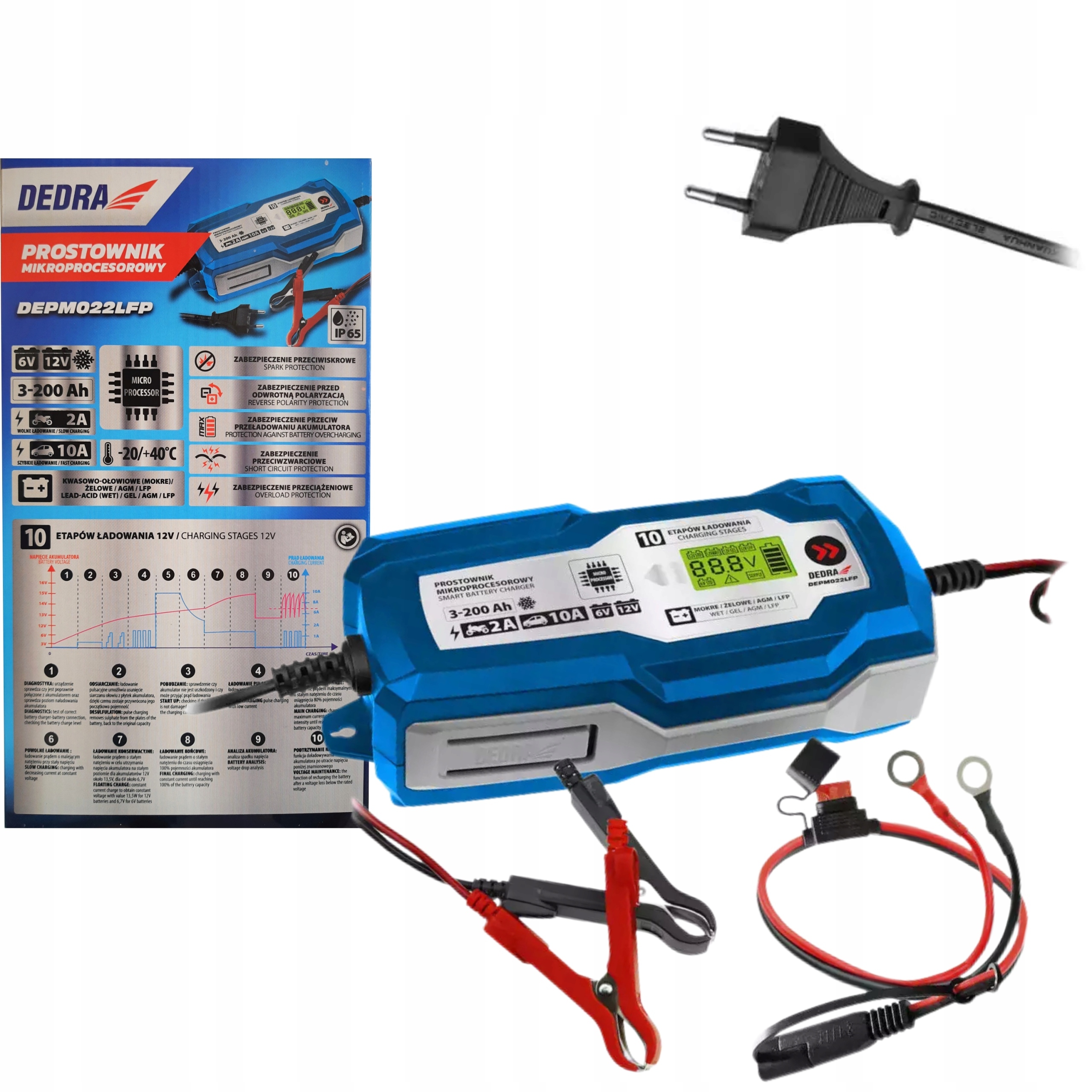 Prostownik DEPM022LFP to urządzenie przeznaczone do ładowania akumulatorów kwasowo-ołowiowych (mokrych), żelowych, AGM, LFP o napięciu 6/12V i pojemnościach 3-200Ah, które są stosowane w motocyklach, samochodach osobowych itd. Urządzenie przeznaczone do wykorzystywania w gospodarstwach domowych, warsztatach naprawczych, pracach amatorskich. Urządzenie ma kompaktową obudowę.