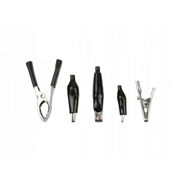 Zestaw krokodylków elektrycznych. W skład zestawu wchodzi 28 sztuk krokodylków w różnych rozmiarach, izolowanych oraz nieizolowanych. Krokodylki wykonane ze stalowej blachy. Całość zapakowana w poręczne opakowanie typu „sortownik” wykonane z tworzywa sztucznego.