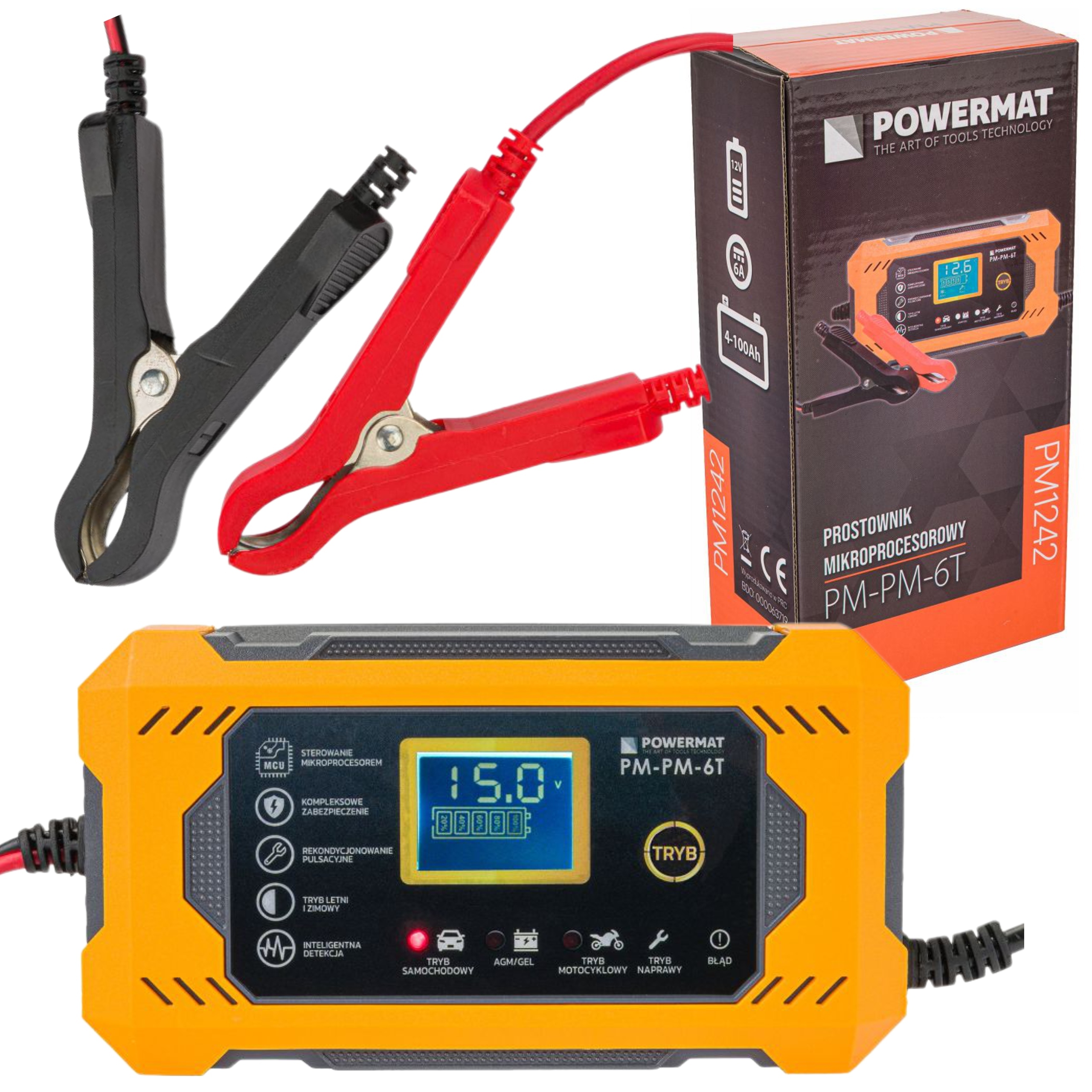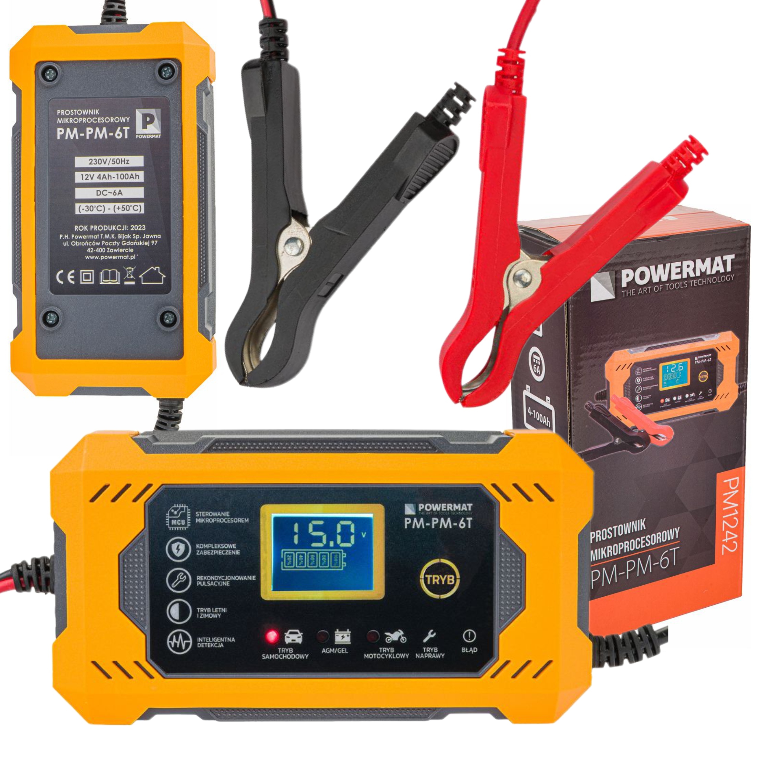 Wysokiej jakości automatyczny i precyzyjny mikroprocesorowy prostownik akumulatorowy POWERMAT PM-PM-6T świetnie sprawdza się w profesjonalnych serwisach i warsztatach samochodowych jak i w przydomowych garażach. Urządzenie może ładować prądem o napięciu 6V i 12V.