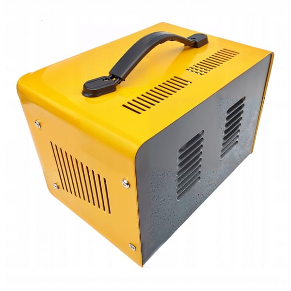 Metalowa obudowa prostownika posiada dużo otworów, dzięki czemu urządzenie jest dobrze wentylowane i chłodzone podczas pracy.